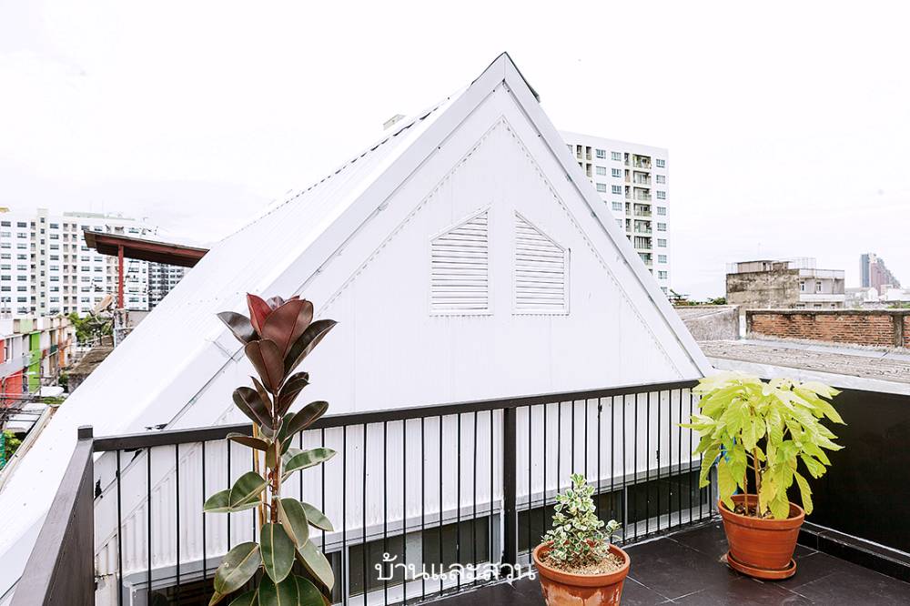“ผมชอบทำเลนี้นะ และยิ่งเห็นตึกเก่านี้ก็ยิ่งสนใจ มันไม่ใช่การออกแบบใหม่ สำหรับสถาปนิกต้องเรียกว่ากัดฟันทำตลอด เพราะต้องประนีประนอมกับโครงสร้างเดิมเยอะเลย สิ่งแรกที่ผมนำมาคิดคือเรื่องฟังก์ชันการใช้งานตามที่ต้องการ ซึ่งก็คือที่อยู่อาศัย ออฟฟิศ และห้องเก็บหนังสือรวมถึงมุมให้ผมได้เล่นดนตรีตามที่ผมรัก ความงามเป็นเรื่องที่ตามมาทีหลัง จริงๆ ผมอยากทาสีด้านนอกให้เป็นสีดำทั้งตึกแล้วทำไม้เลื้อยเขียวๆ เกาะไปตามผนัง แต่พอดีผมไปทำงานที่เวียดนามระหว่างที่ช่างกำลังทาสีบ้าน แม่ผมเลยจัดการทาสีขาวไปเรียบร้อย ก็ต้องเลยตามเลยครับ มาจัดการเรื่องเพิ่มพื้นที่ใช้งานแทน ซึ่งผมมีความฝันในวัยเด็กว่าอยากมีห้องใต้หลังคา ก็เลยต่อเติมดาดฟ้าชั้น 3 เดิมขึ้นมาให้เป็นโถงสูงติดหลังคาจั่ว พร้อมกับเติมดาดฟ้าใหม่เข้าไป และเพื่อโครงสร้างที่แข็งแรงผมยอมลงทุนลงเสาเข็มฐานรากเพิ่ม ส่วนโครงจั่วที่ต่อเติมเป็นโครงสร้างเหล็กที่มีน้ำหนักไม่มากและสามารถรื้อถอนได้ เผื่ออนาคตต้องการปรับเปลี่ยนอีก”