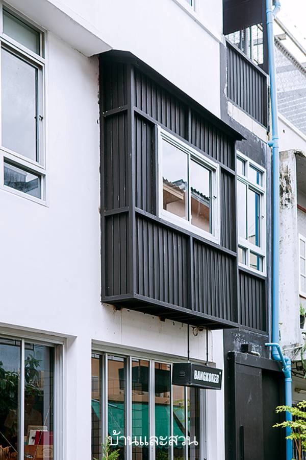 จากอาคารดั้งเดิม 2 ชั้นจึงมาสู่พื้นที่ใช้งานเกือบ 4 ชั้น ชั้นล่างคุณโอมตั้งใจแน่วแน่จะปันพื้นที่ส่วนหนึ่งสำหรับกิจกรรมเพื่อชุมชน ไม่ว่าจะเป็นที่จัดนิทรรรศการ งานศิลปะ หรือที่สอนภาษาอังกฤษให้เด็กๆ ในชุมชน อีกมุมหนึ่งเป็นพื้นที่ขายเสื้อยืดแบรนด์ Bangkoker ที่เขาสกรีนลายขายเองมาตั้งแต่สมัยเรียนจนมีกลุ่มแฟนที่ตามซื้อสินค้าอยู่อย่างเหนียวแน่น ผนังเกือบรอบด้านของชั้นล่างจึงเน้นให้เป็นบานกระจกโปร่ง ที่สามารถมองผ่านได้ง่ายหรือจะเปิดโล่งเพื่อให้สะดวกต่อการขนของต่างๆ