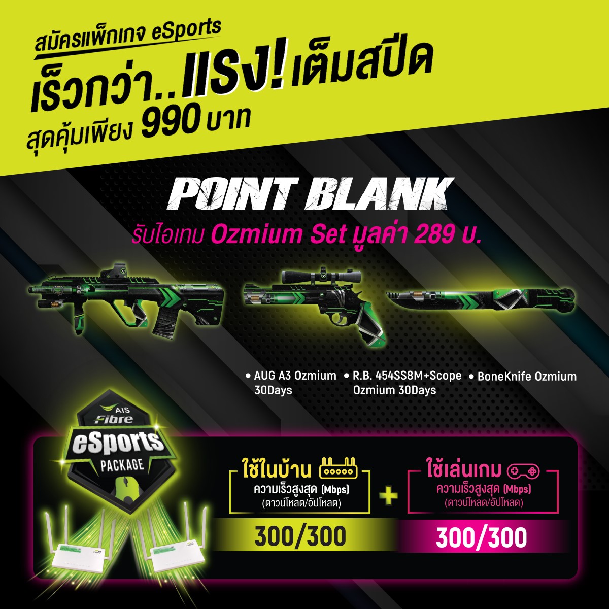 พิเศษสำหรับท่านที่เป็นลูกค้า AIS Fibre eSports Package รับฟรี Ozmium Set มูลค่า 289 บาท ประกอบไปด้วยไอเท็ม 3 ชิ้น คือ AUG 3 Ozmium จำนวน 30 วัน R.B. 454SS8M+Scope Ozmium จำนวน 30 วัน และ BoneKnife Ozmium (1 หมายเลขอินเทอร์เน็ต สามารถรับไอเท็ม 1 สิทธิ์ / 1 เกมส์ / 1 เดือน)