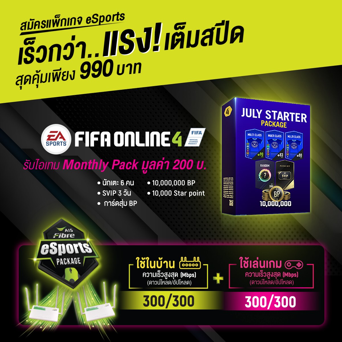 สำหรับท่านที่เป็นลูกค้า AIS Fibre eSports Package รับฟรี Monthly Pack มูลค่า 200 บาทเรียกว่าคุ้มมาก ๆ สำหรับผู้ที่ต้องการเริ่มเล่นใหม่ หรือเสริมให้มี option เพิ่มสำหรับคลังทีมของตัวเองที่มีอยู่แล้ว เพราะท่านจะได้รับ นักเตะเพิ่มขึ้น 6 คน SVIP จำนวน 3 วัน การ์ดสุ่ม BP 1 ครั้ง 10,000,000BP และ 10,000 Star point (1 หมายเลขอินเทอร์เน็ต สามารถรับไอเท็ม 1 สิทธิ์ / 1 เกมส์ / 1 เดือน)