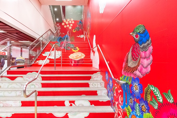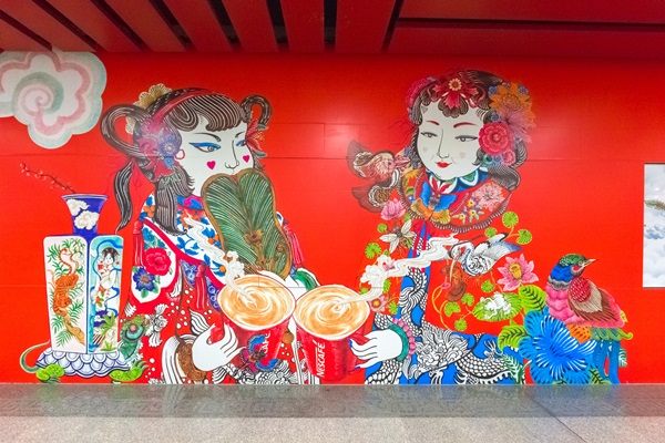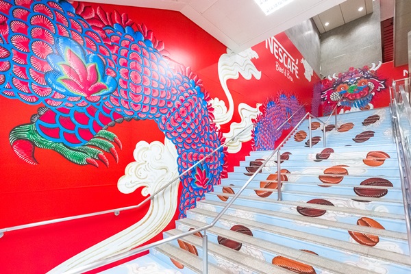 นอกจากเราจะได้เห็นการใช้สีแดง สีทอง ที่สื่อถึงวัฒนธรรมจีนอย่างถ้วนทั่วในสถานี เรายังจะได้เห็นภาพมังกร นก หงส์ เสือ พืชพันธุ์ในจินตนาการ ผสมผสานไปกับภาพผู้คนทั้งไทย จีน ตะวันตก ที่หลอมรวมอยู่ใน “ชุมชนคนรักกาแฟ” จากคอนเซ็ปต์และการออกแบบโดย NESCAFÉ Blend & Brew เพื่อเชิดชูวัฒนธรรมการดื่มกาแฟ และความหลอมรวมทางวัฒนธรรมของผู้คนและชุมชนที่เก่าแก่ที่สุดชุมชนหนึ่งของเมืองกรุงเทพ