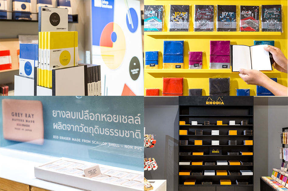 กองทัพสมุดบันทึกและกระดาษจากหลายแบรนด์ชั้นนำทั่วโลก อย่าง LEAUTHERM สมุดสัญชาติเยอรมันชื่อดัง ที่มีอายุยาวนาน 100 กว่าปี โดดเด่นด้วยเนื้อกระดาษคุณภาพและสีสันเป็นเอกลักษณ์ พร้อมเซอร์วิสเบาๆ สลักชื่อบนปกได้ RHODIA แบรนด์ดังจากฝรั่งเศสที่มีมาตั้งแต่ปี 1934 หรือแบรนด์น้องใหม่สายเลือดไทยอย่าง JOUR สมุดบันทึกสาย Traveler ที่สามารถเขียนติดแม้เปียกน้ำ สำหรับคราฟเตอร์สายกรีนต้องไม่พลาดแบรนด์ GRAY RAY เครื่องเขียนแบรนด์ไทย เน้นโปรดักส์รักษ์โลก อย่างยางลบจากเปลือกหอยเชลล์