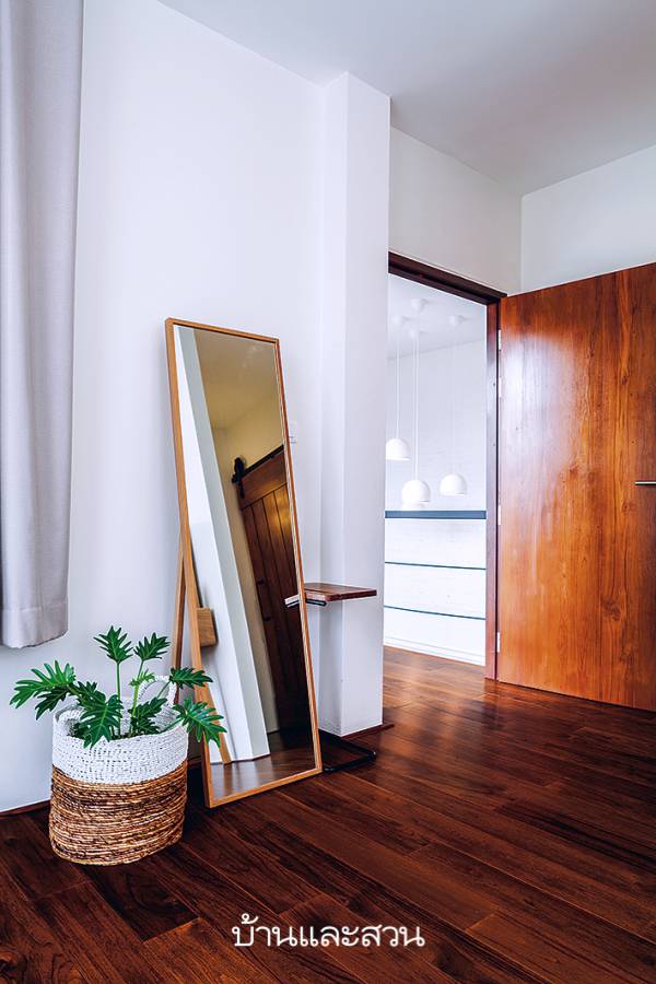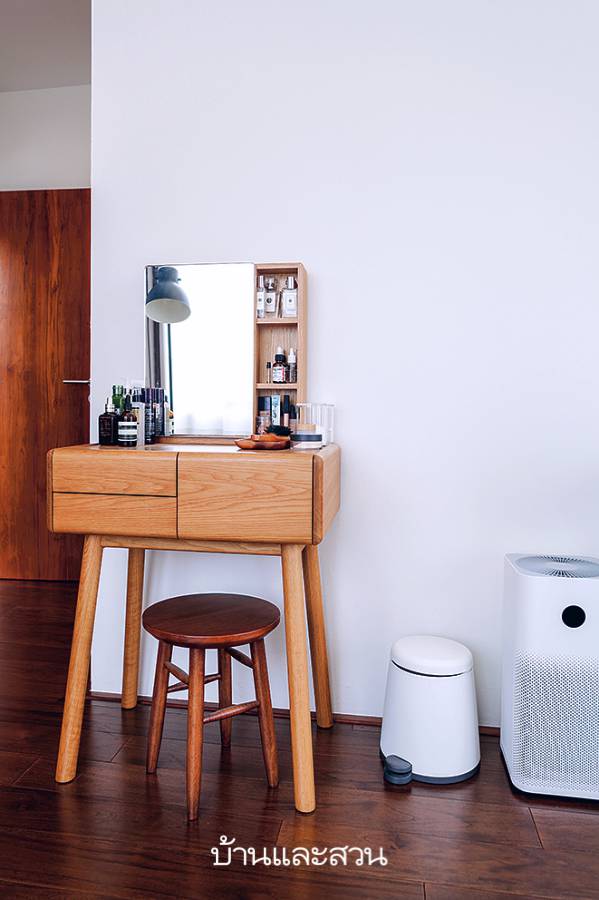 “สมัยที่ตูเช่เป็นแอร์โฮสเตส เขาชอบท่องเที่ยวที่ญี่ปุ่นมากครับ มักซื้อหนังสือหรือนิตยสารเกี่ยวกับงานดีไซน์บ้านและร้านต่างๆ เก็บสะสมไว้ด้วย พอถึงคราวทำบ้านตัวเอง จึงคัดภาพตัวอย่างที่ชอบส่งต่อให้สถาปนิกช่วยร่างแบบขึ้นมา” คุณเบียร์ประสานตา ส่วนคุณตูเช่ยิ้มรับไม้ต่อ “หลังจากบ้านหลังนี้เสร็จก็เคลียร์ของออกไปเยอะมากค่ะ จริงๆ เมื่อก่อนก็ไม่ได้เป็นคนมินิมัลขนาดนี้นะ (หัวเราะ) เพราะตอนเช่เป็นแอร์ได้มีโอกาสท่องเที่ยวเยอะ โดยเฉพาะญี่ปุ่นนี่ชอบมาก เห็นอะไรก็น่าซื้อ เจออะไรก็น่าช็อป พอรู้สึกตัวอีกที อ้าวตัวเองกวาดของไปหมดเกลี้ยงชั้นเลย” เธอพูดด้วยน้ำเสียงมีความสุข ประกายตาฉ่ำวาว ก่อนหัวเราะลั่น