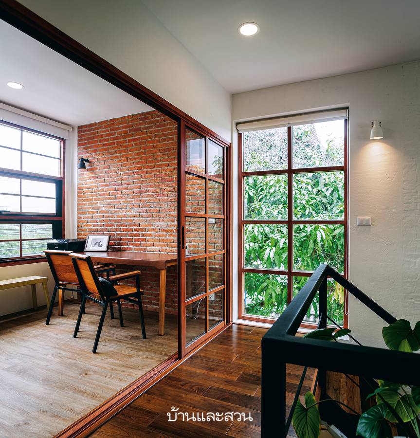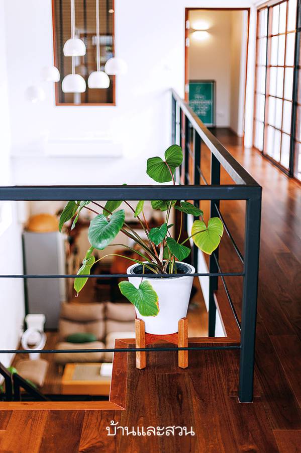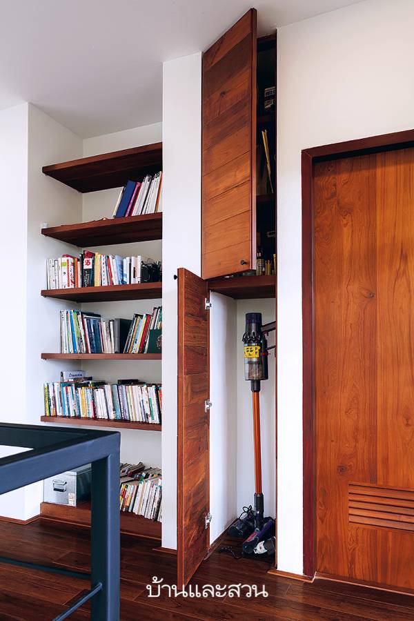 ส่วนชั้นบน นอกจากจะดีไซน์ให้มีห้องนอนใหญ่ ห้องนอนแขก และสวนหินน้อยๆ แต่พองามแล้ว ฝั่งหนึ่งยังออกแบบเป็นห้องทำงานที่เปิดไปสู่ระเบียงผักสวนครัวเล็กๆ น่ารักอีกด้วย แถมผนังบางส่วนยังทำเป็นช่องชั้นหนังสือ และช่องเก็บของได้เก๋และเป็นระเบียบไม่เบา รวมถึงเครื่องเรือนและข้าวของต่างๆ ดูแล้วถูกคัดกรองผ่านกระบวนการความคิดมาเป็นอย่างดี เพราะแต่ละชิ้นที่นำมาจัดวางและใช้สอย ไม่มีหลุดคอนเซ็ปต์ความเป็นมินิมัลเลยสักนิด (เว้นแต่พี่ม้าลายตัวเดียว)