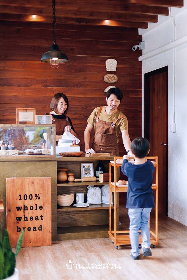 เมื่อหาข้อสรุปได้แล้ว ทั้งคู่จึงจัดแจงว่าจ้างสถาปนิกมาเป็นที่ปรึกษา เพื่อพลิกโฉมบ้านบนเนื้อที่ 50 ตารางวาให้สอดรับกับสิ่งที่ต้องการ โดยเผยตัวบ้านเป็นรูปตัวซี (C) ตรงกลางทำเป็นคอร์ตยาร์ดเล็กๆ ที่มีสนฉัตรยืนต้นคอยต้อนรับจากทางเข้าบ้านด้านข้าง ส่วนด้านหน้าอุทิศเป็นหน้าร้านที่ให้ลูกค้าเข้ามาเลือกซื้อขนมปังกลับบ้าน ซึ่งเปิดเฉพาะวันเสาร์-อาทิตย์ โดยออกแบบให้มีห้องทำขนมปังอยู่เคียงกัน และสามารถเข้าได้ทั้งด้านหน้าร้านและภายในบ้าน