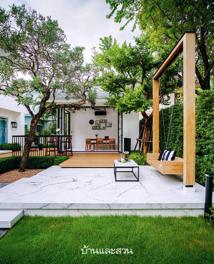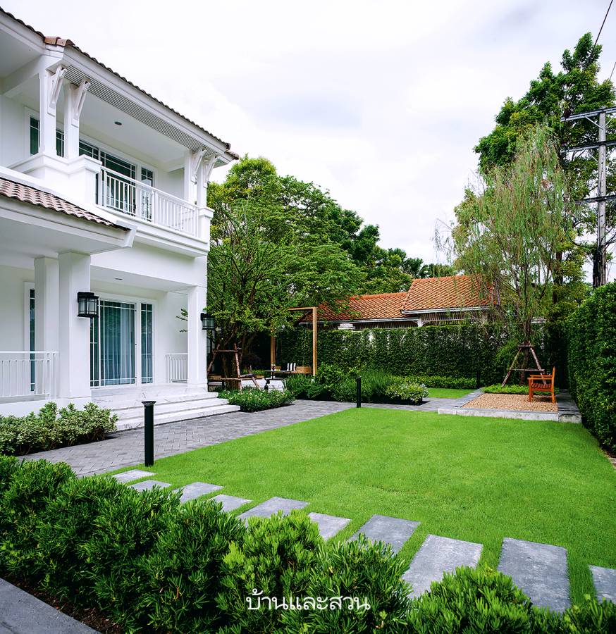 คุณบอย ผู้ออกแบบสวน เล่าถึงหลักการสำคัญในการออกแบบ สวนไตล์โมเดิร์น แห่งนี้ว่า “ต้องดูสัดส่วนการจัดวางพื้นที่ให้สมมาตรสวยงามตั้งแต่ครั้งแรกที่เห็น มีสเปซการใช้สวนที่ต่อเนื่องกัน แล้วใส่รายละเอียดหรือจุดเด่นเข้าไปให้แต่ละมุมดูน่าสนใจ ทั้งพรรณไม้และฮาร์ดสเคปต่างๆ เจ้าของบ้านให้โจทย์มาว่าอยากได้ศาลา มีพื้นที่นั่งเล่นต่อเนื่องมาจากตัวบ้าน ขอสนามหญ้าน้อยๆ ดูเป็นสวนที่เข้ากันได้กับตัวบ้าน เลยใช้สีขาวเป็นหลักในการออกแบบสวน ใช้แพตเทิร์นสี่เหลี่ยมแบ่งสัดส่วนฟังก์ชันการใช้งานและจัดวางทุกอย่างให้อยู่รวมกันเป็นกลุ่ม เมื่อเดินออกจากตัวบ้านมาจากห้องรับประทานอาหารจะพบเทอร์เรซกับศาลา จากศาลาก็มีลานด้านหน้าสำหรับนั่งเล่นกับมุมเคาน์เตอร์บาร์ใต้ต้นไม้ที่ต่อเนื่องกัน และยังมีชิงช้าที่อยู่ติดกันเชื่อมด้วยทางเดินไปยังลานกรวดที่มีม้านั่งยาววางอยู่ใต้ต้นไม้ บริเวณนี้จะร่มในช่วงเช้าประมาณ 2-3 ชั่วโมง ไว้สำหรับนั่งเล่นจิบกาแฟก่อนออกไปทำงาน ใส่แปลงปลูกกลางคอร์ตยาร์ดดูคล้ายวงเวียนในสวน เพื่อให้การใช้งานลื่นไหลต่อเนื่องกันในกรณีที่มีกิจกรรมหรือปาร์ตี้ที่มีคนจำนวนมาก