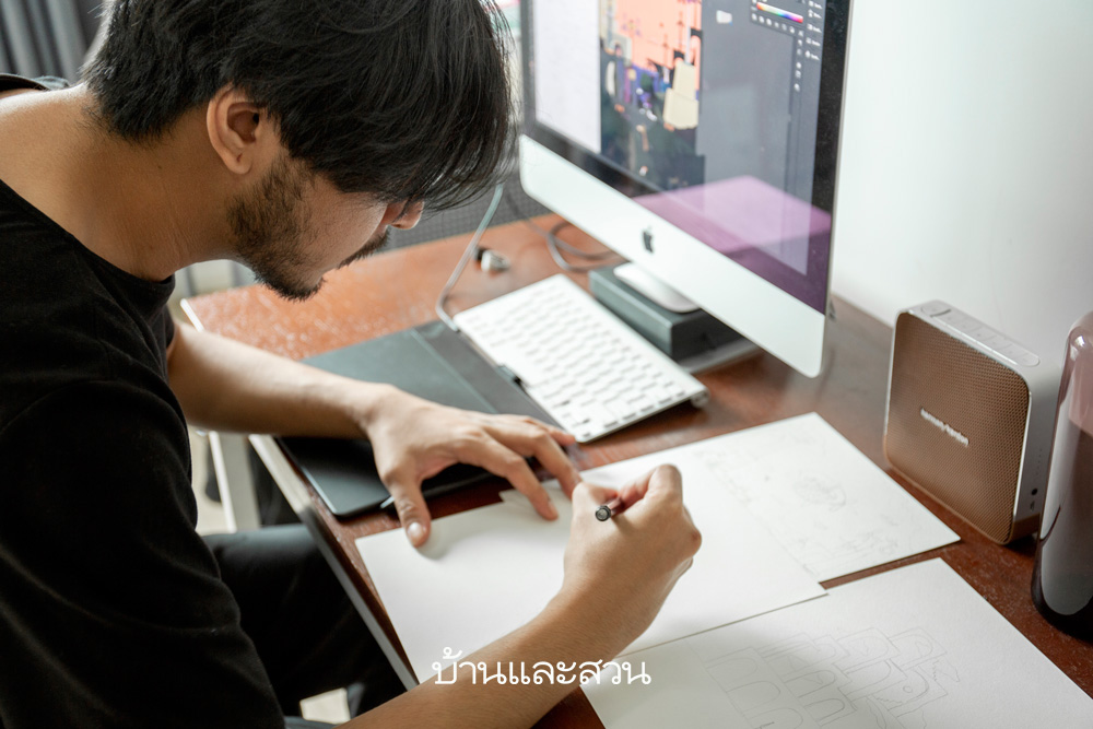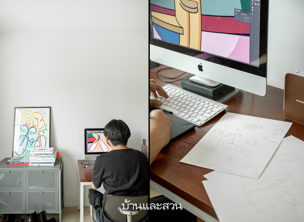 “ช่วงแรกเราทำงานเกี่ยวกับงาน Lettering และพวกงาน Typography ตอนนั้นเป็นการทดลองนำพวกรูปทรงเรขาคณิตมาผสมกันเป็นชุดตัวหนังสือก่อน จากนั้นก็ได้พัฒนากับมันมากขึ้นโดยออกแบบให้อยู่ในฟอร์มของ Object แบบสถาปัตย์” คุณเบนซ์เล่าให้ฟังเมื่อถามถึงจุดเริ่มต้นของสไตล์งานในแบบของเขา ซึ่งมีลายเส้นงานศิลปะแบบ 2D หรือ Flats โดยมีแสงเงาและฟอร์มของ Object ที่ดูคมชัดเป็นเอกลักษณ์ หรือที่คุณเบนซ์ให้นิยามลายเส้นของเขาว่าเป็นลายเส้นที่แข็งกระด้าง