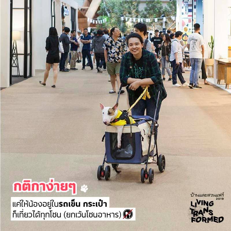 - ให้น้องอยู่ในรถเข็น กระเป๋า หรือภาชนะ โดยต้องปิดในมิดชิด ไม่ให้รบกวนผู้อื่น