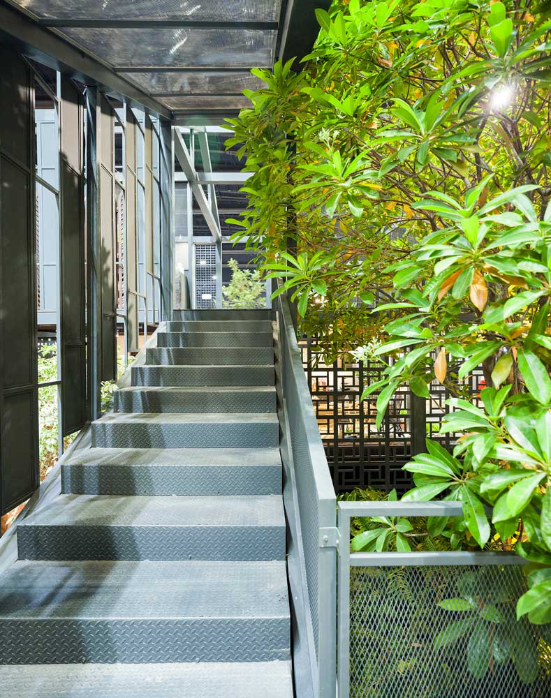 บันไดขึ้นชั้นบนกรุผนังโปร่งและหลังคาโปร่งแสง เป็นทางเดินแบบเปิดโล่งที่ให้ความรู้สึกแบบบ้านไทยสมัยก่อน
