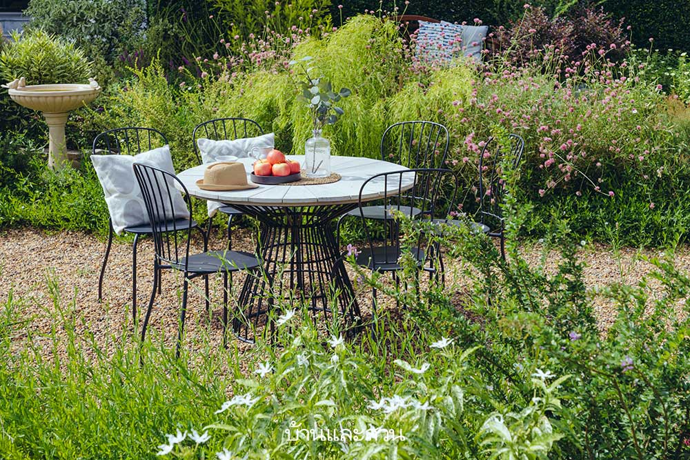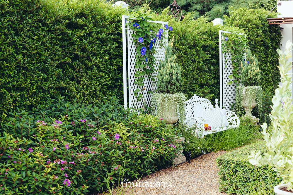 “เราหาผู้ออกแบบอยู่หลายเจ้า ในที่สุดก็ตัดสินใจเลือก คุณอรรถ ประพันธ์วัฒนะ ซึ่งเขาก็จะถามเราว่าชอบสวนแบบไหน ชอบอะไร ไม่ชอบอะไรบ้าง เราก็ไม่อยากไปตีกรอบเขา จึงขอแค่เป็นสวนอังกฤษ ชอบดอกไม้สีม่วง สีชมพู ไม่เอาสีเหลือง ดูแลง่ายๆ จากนั้นคุณอรรถก็ออกแบบมาให้ดู ตอนแรกลังเลว่าของจริงจะออกมาสวยเหมือนในภาพไหม แต่คุณอรรถก็ทำได้เหมือนแบบเป๊ะเลยค่ะ”
