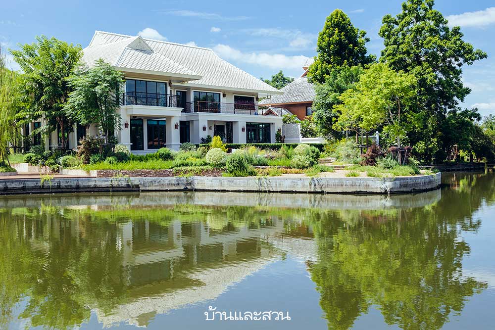 “โซนที่สามคือด้านหลังบ้านที่ติดริมน้ำครับ พื้นที่บริเวณนี้ค่อนข้างกว้างและมีความชันมาก ผมแก้ปัญหาด้วยการทำเป็นสเต็ปเล่นระดับเพื่อเพิ่มประโยชน์ใช้สอยให้มากขึ้น ส่วนมุมมองจากตัวบ้านไปยังสระน้ำ ผมไม่อยากให้มีต้นไม้ใหญ่มาบังวิวสวยๆ จึงเลือกปลูกไม้ใหญ่ที่บริเวณด้านข้างแทน พื้นที่ตรงกลางจัดเป็นสวนแนวคอตเทจ มีต้นไม้หลากหลายชนิดขึ้นรวมกันเป็นกลุ่มๆ กระจายไปทั่วๆแปลงปลูกต้นไม้ เพิ่มความเป็นชนบทด้วยการใช้หินเทียมกรุผิวกระบะปลูก พื้นโรยกรวดสีน้ำตาลขนาดเล็กเพื่อให้ดูเป็นธรรมชาติ วางชุดนั่งเล่นและของตกแต่งสวน เช่น อ่างน้ำนก แทรกตามพุ่มไม้บางจุด เพื่อให้สวนดูมีชีวิตชีวามากขึ้นครับ”