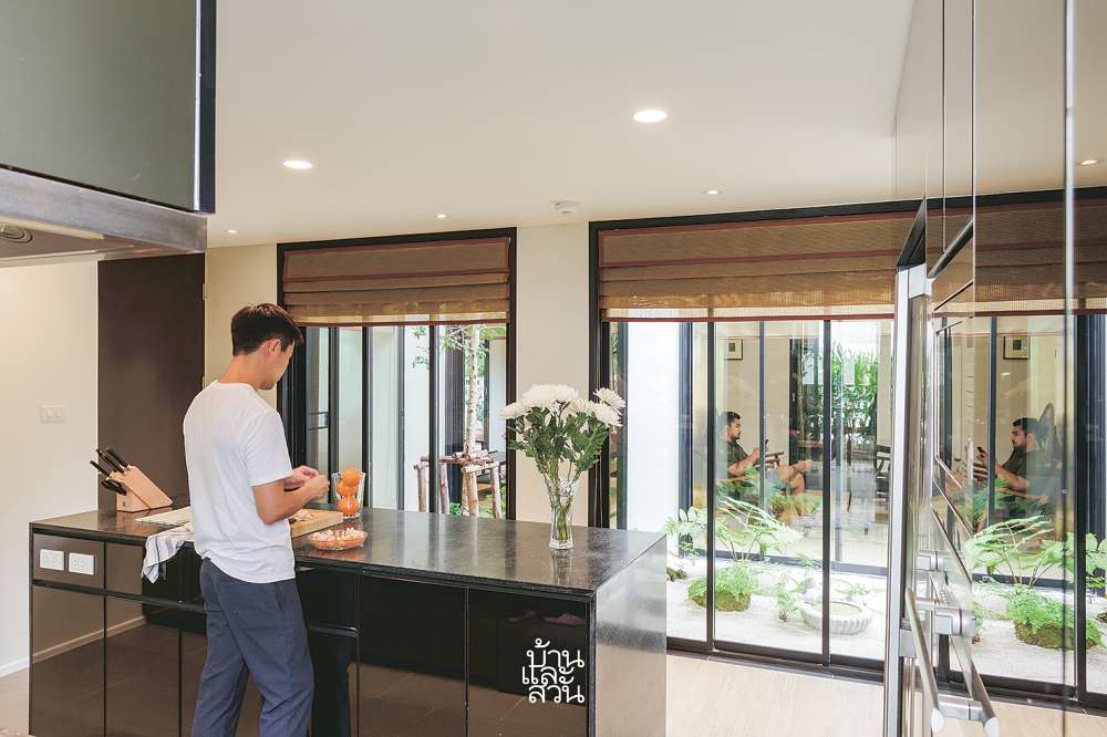 คุณกานต์เลือกใช้ครัวโทนสีดำเข้มทั้งส่วนท็อปหินบริเวณเคาน์เตอร์เตรียมอาหารกลางห้องและชุดครัวทั้งหมด สลับกับการติดกระจกเทาที่หน้าบานเพิ่มความโปร่งแบบไม่รกตา เพราะตั้งใจเน้นมุมมองของสวนญี่ปุ่นตรงคอร์ตกลางบ้านให้โดดเด่นกว่า ไม่ว่าจะมองจากห้องนั่งเล่นฝั่งตรงข้ามหรือมองออกมาจากในครัว ขณะที่มุมอื่นของบ้านมีการนำองค์ประกอบของเอเชียเข้ามาตกแต่งผสมผสาน ไม่ว่าจะเป็นการปูพื้นห้องนั่งเล่นด้วยเสื่อทาทามิ การใช้เฟอร์นิเจอร์สไตล์จีน ร่วมไปกับการนำเฟอร์นิเจอร์เดิมของบ้านมาบุผ้าและทำสีใหม่อย่าง ชุดโซฟาไม้ในห้องนั่งเล่น และตู้เก็บของใต้บันได