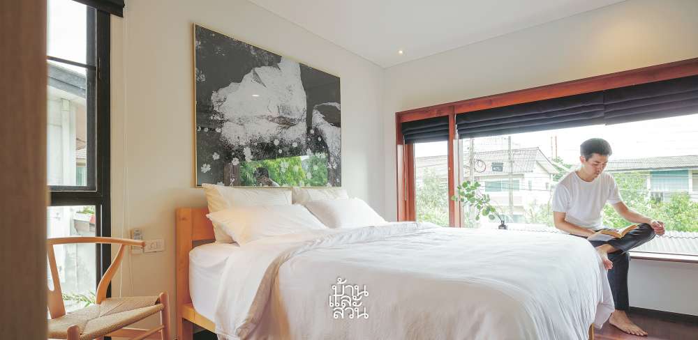 เนื่องจากครอบครัวนี้มีสมาชิกในบ้านหลายคนรวมกัน 3 รุ่น บริเวณชั้นสองของบ้านจึงออกแบบให้เป็นห้องนอนทั้งหมด 4 ห้อง ขนาดเล็กใหญ่ตามพื้นที่และการใช้งาน โดยห้องคุณกานต์อยู่หน้าบ้านซึ่งเน้นความโปร่งจากช่องกระจกที่ปรับเปลี่ยนมาจากหน้าต่างเล็กๆ ของบ้านเดิมให้ใหญ่และทันสมัยขึ้น พร้อมทั้งเพิ่มมุมมองของความเป็นญี่ปุ่นเข้าไปเล็กน้อยด้วยพื้นที่เล็กๆ ตรงขอบหน้าต่างที่สามารถใช้วางหนังสือหรือนั่งเล่นได้
