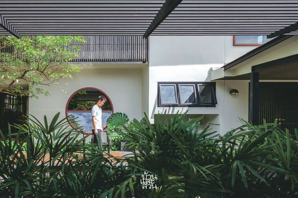 คุณเอ็กซ์ สถาปนิกผู้ออกแบบพาเราเดินชมพื้นที่รอบๆ บ้านพร้อมเล่าถึงแนวคิดนี้ว่า “เพราะบ้านเดิมเน้นแปลนนิ่งแน่นๆ ผมเลยเจาะคอร์ตตรงกลางบ้านเพื่อให้บ้านหายใจได้แล้วจัดพื้นที่ใช้สอยไว้รอบคอร์ต ทำส่วนจอดรถด้านหน้าใหม่ ย้ายบ่อปลาหลังบ้านมาอยู่ข้างหน้ารวมกันเป็นพื้นที่คอร์ตแรกก่อนเข้าถึงตัวบ้าน และย้ายประตูทางเข้าบ้านมาอยู่ฝั่งขวาแทน ปรับช่องหน้าต่างใหม่ให้ดูทันสมัยขึ้นแล้วติดระแนงไม้ด้านหน้า เปิดช่องหน้าต่างทรงกลมที่อยากให้เป็นจุดเด่นอยู่กลางบ้านช่วยเพิ่มองค์ประกอบที่มีความเป็นญี่ปุ่นนิดๆ แบบที่เจ้าของบ้านชอบ แต่ทั้งหมดอยู่บนโครงสร้างบ้านหลังเดิม”