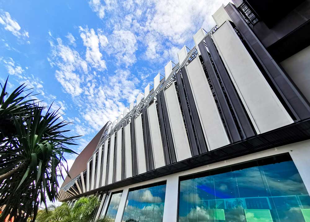 เป็นระบบผนังระบายอากาศ (Ventilated Facade System) เพื่อช่วยลดความร้อนเข้าสู่อาคาร ช่วยประหยัดพลังงาน ระบายอากาศด้วย Stack Effect Ventilation (การระบายอากาศโดยกระแสลมธรรมชาติและการระบายอากาศในภาวะความแตกต่างของอุณหภูมิอากาศ) มีสีเคลือบสะท้อนรังสีด้วยความร้อน มีการหน่วงความร้อนเข้าสู่อาคาร ปราศจากส่วนผสมของพลาสติก และสามารถนำกลับมาใช้ใหม่ได้ โดยใช้วัสดุผนังแผ่นผนังไฟเบอร์ซีเมนต์ ผลิตขึ้นจากแผ่นซีเมนต์คอมโพสิตความหนาแน่นสูง (High Density) ผลิตด้วยกรรมวิธีการอัดกำลัง ส่งผลให้ตัวแผ่นมีความแข็งแรงสูง ทนต่อการโก่งงอ และทนต่อแรงกระแทก มีความพรุนต่ำ จึงมีการดูดซึมน้ำและการยืดตัวต่ำกว่าแผ่นไฟเบอร์ซีเมนต์ทั่วไปซึ่งมีความหนาแน่นปานกลาง (Medium Density)