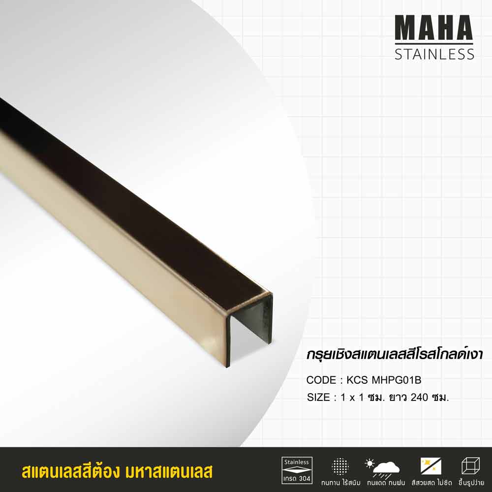 -กรุยเชิงสเตนเลสสีโรสโกลด์เงา ผิวเงา ขนาด 1×1 เซนติเมตร ยาว 2.40 เมตร ราคาเส้นละ 890 บาท