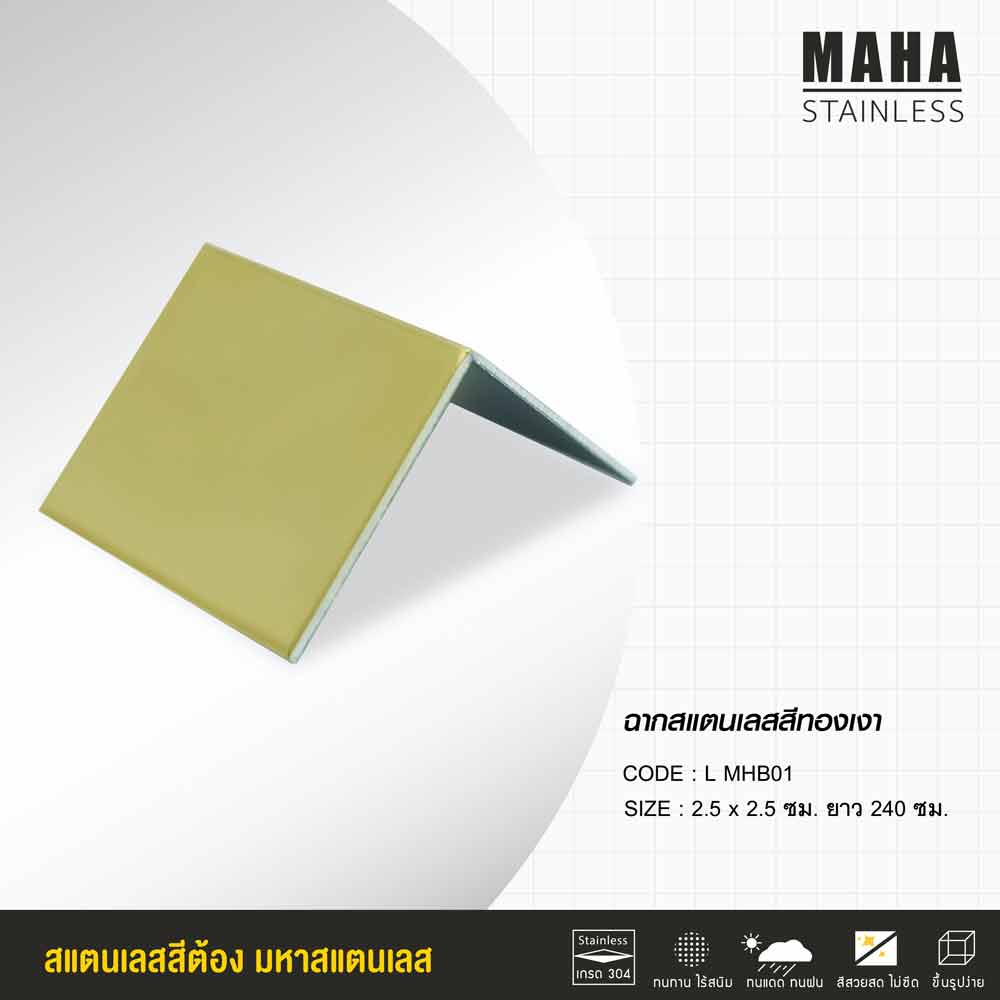 -เหล็กฉากสเตนเลสสีทอง ผิวเงา ขนาด 2.5×2.5 เซนติเมตร ยาว 2.40 เมตร ราคาเส้นละ 1,350 บาท