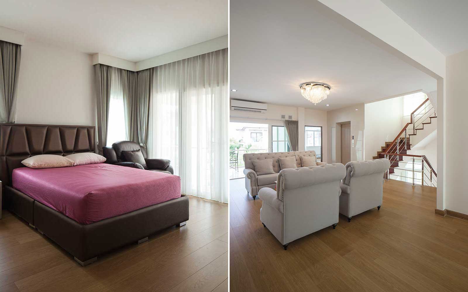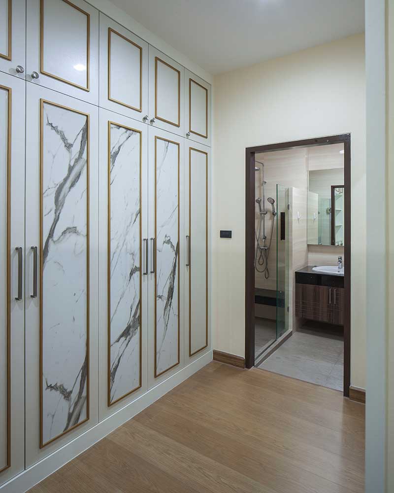 งานตกแต่งภายในของทั้งหลัง คุณเล็กวางใจให้ทีมจากบริษัทรอยัลเฮ้าส์ ดีไซน์เป็นผู้ออกแบบให้ทั้งหมด ภายใต้โจทย์เรียบหรู ดูดี จึงเลือกคุมโทนสีขาว ครีม น้ำตาล เสริมด้วยสีทอง และลายหินอ่อนในบางส่วน ยิ่งช่วยขับให้บ้านดูโดดเด่น หรูหรายิ่งขึ้น