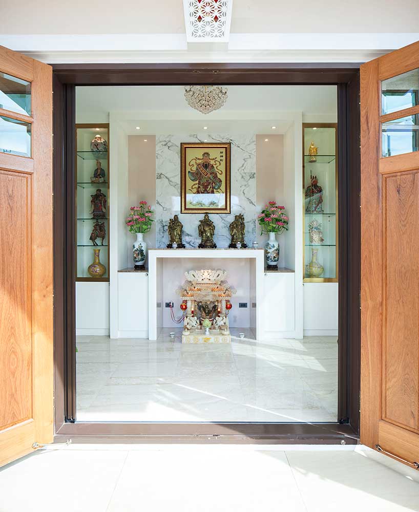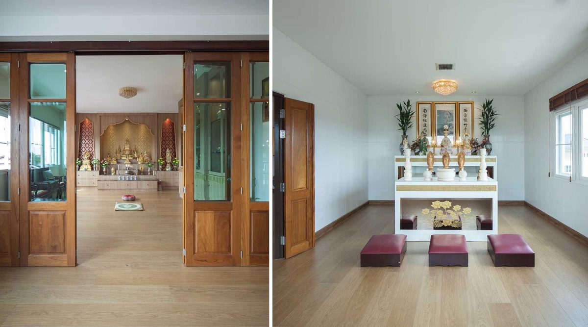 สำหรับชั้นสาม ชั้นสุดท้ายมีเพียงหนึ่งห้องนอน ส่วนพื้นที่ที่เหลือจัดสรรเป็น 2 ห้องพระ โดยห้องหนึ่งเป็นห้องพระแบบไทย ๆ และอีกห้องเป็นห้องเทพเจ้าแบบจีน