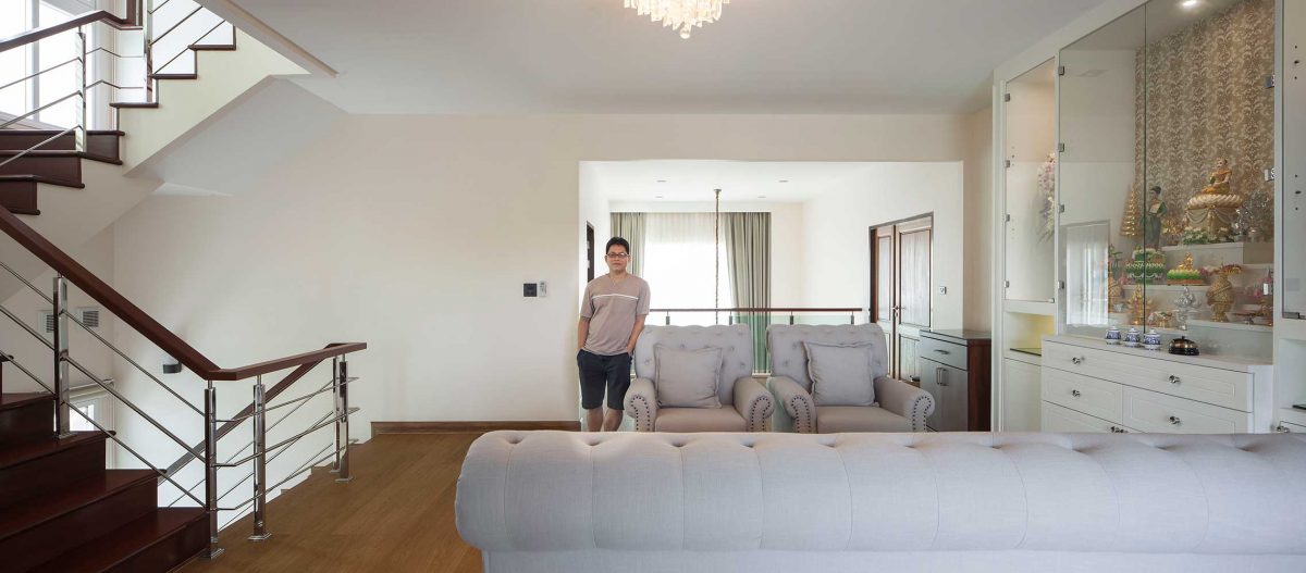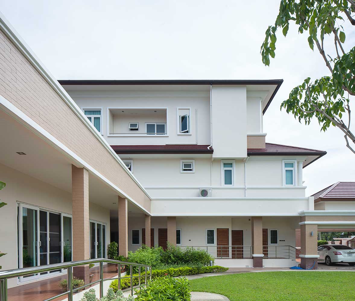 เมื่อความตั้งใจคืออยากสร้างบ้านหลังใหม่ให้คุณแม่อยู่อาศัยแทนทาวน์เฮ้าส์ขนาด 3 ชั้นหลังเดิมที่มีความคับแคบและไม่สะดวกต่อการใช้งานของผู้สูงอายุ โดยมีโจทย์ว่า “ต้องเป็นบ้านที่คุณแม่อยู่สบายที่สุด ผ่อนคลายที่สุด และสามารถชมวิวได้ทั้งวิวสวนและวิวแม่น้ำ” คุณเล็ก-พรชัย ศรีณรงค์ และพี่น้องจึงตัดสินใจมาซื้อที่ดินเปล่าในหมู่บ้านย่านกิ่งแก้วแล้วสร้างบ้านเดี่ยวแทน