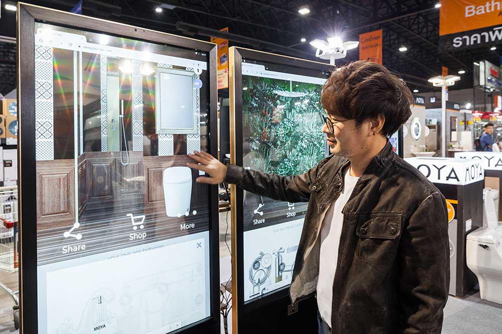 ที่น่าสนใจอีกอย่างในงานคือแคตตาล็อกแบบ E-Catalog ที่ช่วยสร้างแรงบันดาลใจในการตกแต่งห้องน้ำ สามารถทดลองหาสินค้าได้ด้วยตัวเอง เพื่อค้นหาไอเดียใหม่ ๆ ในการตกแต่งห้องน้ำ ซึ่งต้องบอกว่าเป็นแคตตาล็อกที่ใช้งานง่าย เห็นตัวอย่างสินค้าชัดเจน ไม่ว่าจะเป็น กระเบื้อง สุขภัณฑ์ และแอคเซสซารี่ต่าง ๆ แถมยังดาวน์โหลดกลับไปดูต่อที่บ้านให้ลองแมตซ์กับห้องตามแบบที่ชอบ