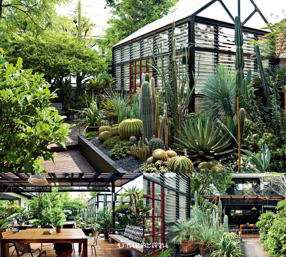 เราขับรถเข้าซอยที่แยกจากถนนรามคำแหง ผ่านตลาดที่แสนจะจอแจด้านหน้า กระทั่งเข้ามาถึงบ้านเดี่ยวขนาด 145 ตารางวาซึ่งดูเงียบสงบภายใต้เหล่าต้นไม้อันแสนร่มรื่นหลังนี้ คุณอนุภาพ พงษ์นะเมตตา เจ้าของบ้านและผู้กำกับหนังโฆษณาของ Mucky-Muck Co., Ltd. เล่าว่า เพิ่งจะย้ายเข้ามาอยู่ที่นี่ได้สองปีกว่า บ้านหลังนี้เป็นบ้านเก่าซึ่งต่อเติมใหม่ เดิมเคยมีพญาสัตบรรณขนาดใหญ่มาก แต่กิ่งและรากแผ่เข้าไปยังข้างบ้าน จึงจำเป็นต้องตัดออก เหลือเพียงปีบริมรั้วหน้าบ้านไว้ รอบบริเวณบ้านจัดวางพรรณไม้หลากชนิด ทั้งที่รูปทรงแปลกตาและที่คุ้นเคยกันดี เป็นกลุ่มเป็นมุมตามลักษณะนิสัยของพืชในกลุ่มนั้นๆ มีทั้งพรรณไม้แบบสวนเมืองร้อนซึ่งดูร่มรื่นขนานไปกับที่จอดรถและข้างบ้าน แต่ที่เด่นที่สุดคือ สวนแคคตัส แบบทะเลทราย และโรงเรือนกระจกประตูสีแดงสดหน้าตาทันสมัย ดูเหมือนสวนตามบ้านในต่างประเทศ อ่านต่อ