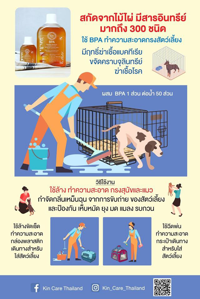 เมื่อเนื้อตัวของสัตว์เลี้ยงสะอาด ปลอดจากเชื้อโรค เชื้อรา เห็บ หมัดและปัญหาผิวหนังต่าง ๆ เรียบร้อยแล้ว ก็ถึงคราวที่จะต้องหันมาดูแลสิ่งแวดล้อม สภาพความเป็นอยู่ของพวกเขากันบ้างค่ะ เริ่มต้นจากบริเวณที่น้องหมานอนอยู่เป็นประจำอย่างกรง หรือคอก ใช้ BPA. Kin Careผสมกับน้ำสะอาดใน อัตราส่วน 1:50 ml ใช้สําหรับล้างทําความสะอาดกรงและกระเป๋าสำหรับใส่สัตว์เลี้ยง แทนน้ำยาฆ่าเชื้อ เพื่อป้องกันเห็บ หมัด เชื้อโรค เชื้อรา ไวรัส และแบคทีเรียที่อาจจะซ่อนตัวอยู่ตามซอกต่าง ๆ ให้หายไป และยังสามารถกำจัดกลิ่นไม่พึงประสงค์อื่น ๆ ของสัตว์เลี้ยงชนิดอื่น ๆ ได้อีกด้วย