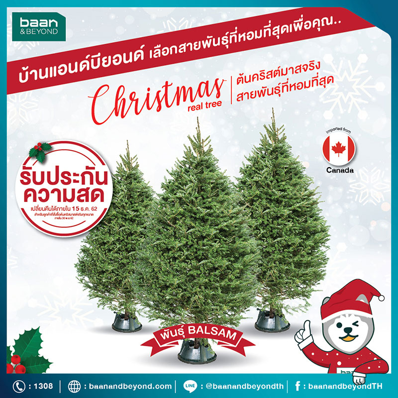 สำหรับต้นคริสต์มาสสดที่เราแนะนำให้นำมาประดับตกแต่งบ้านนั้น ควรเลือกซื้อ สายพันธุ์ Balsam ซึ่งเป็นสายพันธุ์ที่มีความหอมที่เป็นเอกลักษณ์ ชวนให้นึกถึงบรรยากาศของเทศกาลคริสมาสที่แสนอบอุ่น ต้นคริสต์มาสสดทุกต้นจาก Baan and Beyond ผ่านขบวนการการปลูกที่ใส่ใจและคัดสรรมาเป็นอย่างดี ส่งตรงจากเมือง Lunenburg County รัฐ Nova Scotia ประเทศแคนนาดา มาให้คุณได้เลือกซื้อกันถึง 3 ขนาดด้วยกัน ทั้ง รุ่นใหญ่ไซส์ XL ขนาด 245 x 280 ซม. , ขนาดกลาง ขนาด 214 x 245 ซม. และขนาดเล็ก ขนาด 183 x 214 ซม. ทุกขนาดมาพร้อมกับฐานรองต้นเพื่อความสะดวกสำหรับการเคลื่อนย้าย คุณสมบัติความคงตัวของกิ่งก้านที่มีความแข็งแรงเหมาะแก่การห้อยของประดับตกแต่งด้วยของตกแต่งน่ารัก ๆ ได้แบบไร้ความกังวล