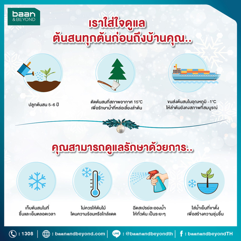 การดูแลต้นคริสต์มาสนั้นก็ไม่ได้ยากอย่างที่คิดเลยค่ะ เพียงตั้งต้นคริสต์มาสไว้ในบริเวณที่มีความชื้นและเย็น หลีกเลี่ยงการโดนลม ความร้อน และแสงแดดโดยตรง สามารถเพิ่มความสดชื่นให้กับต้นคริสต์มาสได้ด้วยการเสปรย์น้ำสะอาดไปทั่วทั้งต้นเป็นระยะ ๆ เพื่อความสดชื่นที่ยาวนาน ควรใส่น้ำเย็นหรือน้ำแข็งก้อนลงในฐาน เพื่อเพิ่มความชุ่มชื้น แถมเป็นการยืดเวลาให้ความสดใหม่ของใบและกิ่งอยู่กับบ้านเราไปอีกนาน