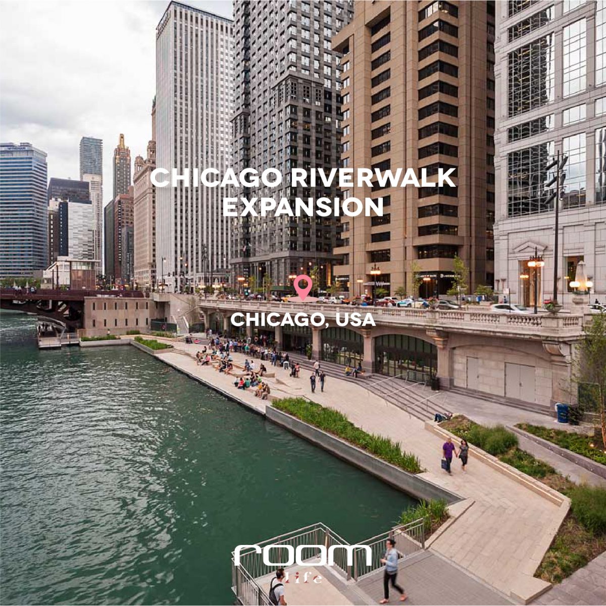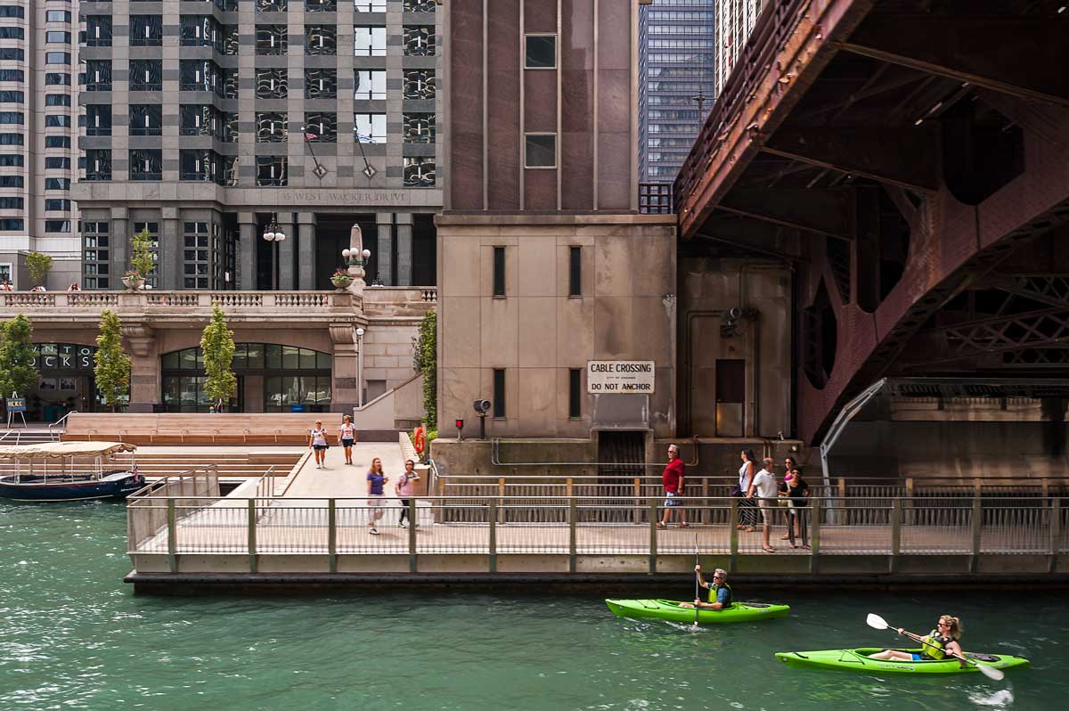 แม่น้ำ Chicago เคยเป็นทางน้ำรองรับโรงงานอุตสาหกรรมหนักในเมือง จึงจากที่เคยเต็มไปด้วยมลภาวะ ในช่วงปีหลังเมื่อแม่น้ำได้ถูกบำบัด ได้นำมาซึ่งโครงการการสร้างทางเดินริมน้ำเพื่อเปลี่ยนหน้าที่ของแม่น้ำในเมืองใหม่ ทางเดินนี้เป็นทางที่ยื่นเข้าไปในแม่น้ำเป็นช่วงๆ ต่อเนื่องจากโครงการเดิมที่เสร็จเมื่อปี 2009 จุดประสงค์หลักเพื่อให้คนเดินริมน้ำได้โดยไม่ถูกกีดขวางโดยถนน โดยในระหว่างที่พาดผ่านพื้นที่ทั้งหมด 6 บล็อก แต่ละบล็อกก็จะถูกออกแบบให้มีหน้าที่แตกต่างกันไปตามความเหมาะสมของแต่ละจุด เช่น เป็นส่วน Plaza เอื้อเป็นที่นั่งในบริเวณที่มีร้านอาหาร ในบริเวณที่เป็นเวิ้งมีการเปิดให้บริการเช่าเรือคายัค รวมถึงบางช่วงก็เป็นขั้นบันไดให้ชาวเมืองนั่งชมทัศนียภาพริมแม่น้ำได้