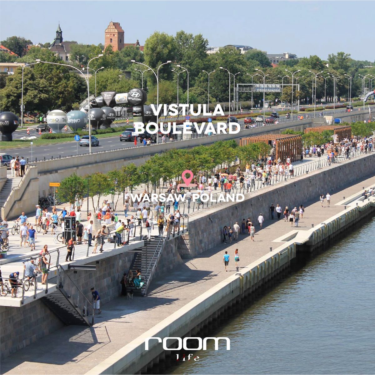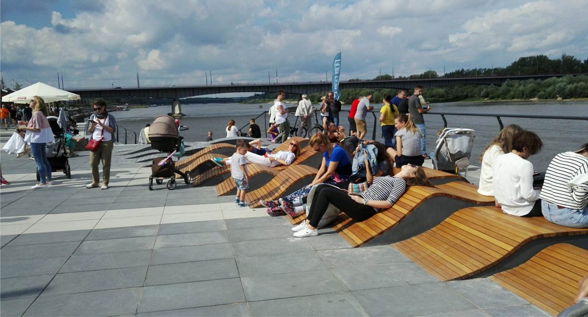 ทางเดินริมแม่น้ำ Vistula แห่งนี้ ตั้งอยู่ระหว่างส่วนเมืองเก่าแก่และเมืองใหม่ พื้นที่แห่งนี้นอกจากจะตอบเรื่องการท่องเที่ยว ก็ยังเป็นที่ที่ให้คนภายในละแวกใช้ทำกิจกรรมสร้างสรรค์ต่างๆ ได้ โดยพื้นที่ส่วนใหญ่ของลานยังถูกออกแบบให้สามารถรับน้ำท่วมสูงเพื่อสัมพันธ์กับน้ำขึ้น – น้ำลงที่จะเกิดขึ้นเป็นประจำทุกปี โดยมีผนังและขั้นบันไดลดหลั่นลงไปกั้นคล้ายเขื่อน และยังมีการออกแบบที่นั่ง และโครงสร้างเปล่ารองรับกิจกรรม รวมถึงพื้นที่สีเขียว รวมถึงต้นไม้ กระจายไปทั่วทั้งลาน
