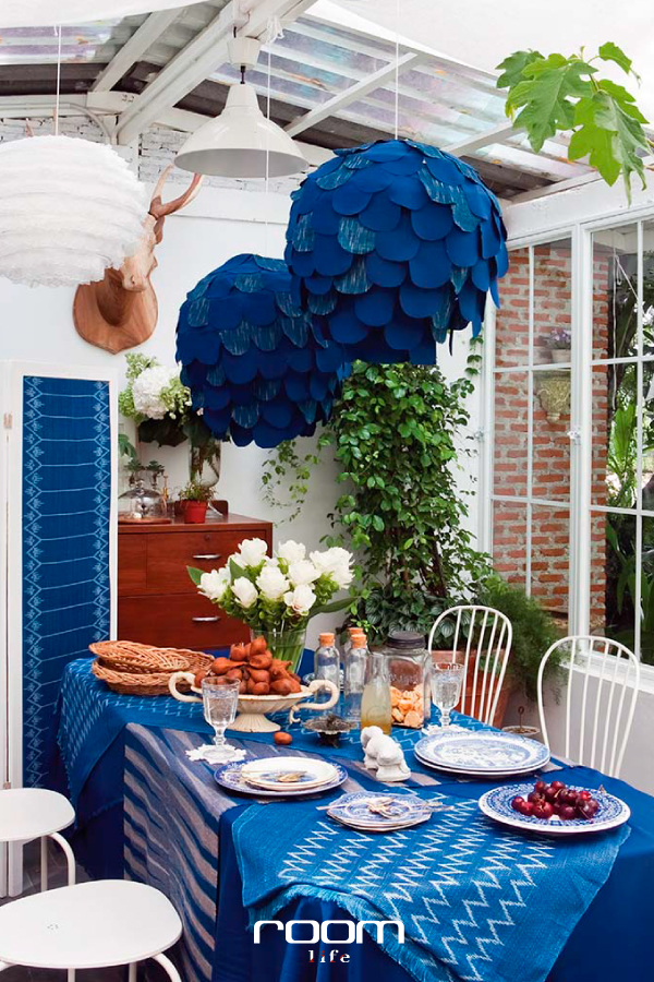 น้ำเงินคลาสสิกหรือจะสู้สีครามไทย ๆ นี่คือไอเดียตกแต่งโต๊ะอาหารให้ชวนสะดุดตา ด้วยการปูผ้าย้อมคราม เริ่มจากเลือกผ้าสีล้วนที่มีหน้ากว้างปูเป็นพื้น แล้วนำผ้าลายต่าง ๆ มาปูทับไปมาในแนวเฉียงบ้างตรงบ้างให้น่าสนใจ แนะนำให้เลือกลายที่เป็นกราฟิกเพื่อให้ดูร่วมสมัยและไม่ลายตาเกินไป สุดท้ายนำของตกแต่งโต๊ะอาหารอย่างชุดจานชามลายครามสวย ๆ มาจัดวางให้เข้าเซต