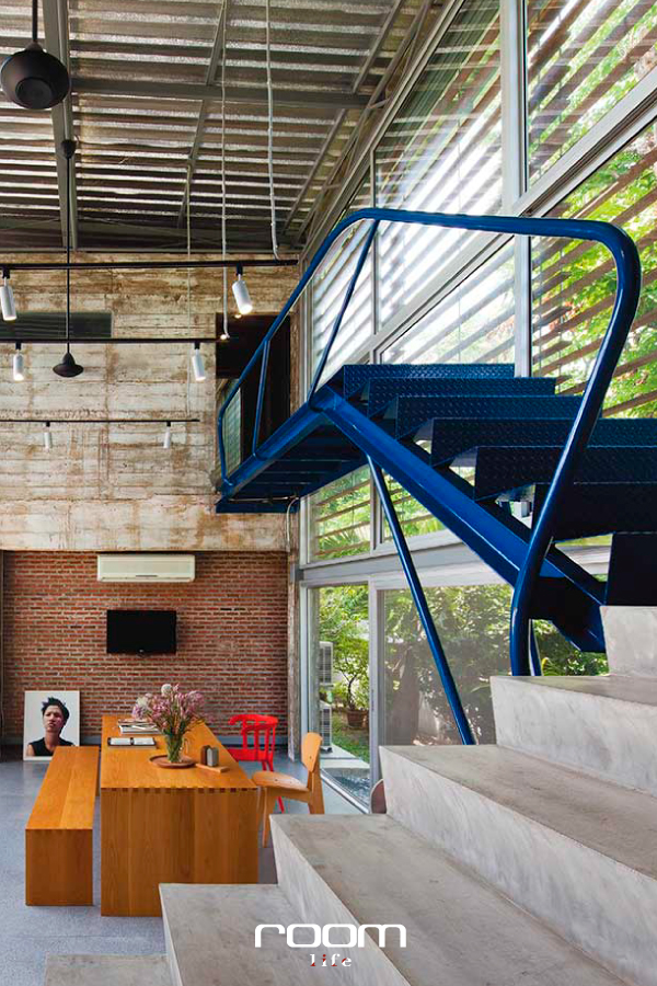 เติมจุดเด่นให้บ้านด้วยบันไดเหล็กสีน้ำเงินสด ไอเดียนี้มาจากบ้านคอนกรีตเปลือยของคุณน้ำค้าง ปริวุฒิพงศ์ ที่ออกแบบให้โล่งสบาย แบบโถงดับเบิ้ลสเปซเพื่อเชื่อมต่อขึ้นไปยังชั้นบนได้อย่างลงตัว