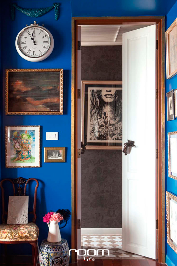 ใช้สีน้ำเงินเป็นฉากหลัง ด้วยคอนเซ็ปต์บ้านกึ่งหอศิลป์ เน้นตกแต่งด้วยชิ้นงานศิลปะและกรอบรูปที่นำมาติดผนัง ดูละลานตา แล้วเสริมด้วยเก้าอี้โบราณและสตูลเซรามิกแบบจีนเพื่อเพิ่มความลงตัวในภาพรวม