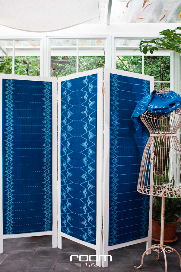 ไอเดียนี้อาจถูกใจคนรุ่นใหม่ที่มีพื้นที่ห้องจำกัด และอยากได้ฉากกั้นสวย ๆ เพื่อแบ่งพื้นที่ใช้สอยให้ชัดเจนขึ้น ลองเริ่มจากการหาฉากไม้ตัวหลักสักอัน จะซื้อแบบทำสำเร็จแล้วหรือจะสั่งทำตามขนาดที่ต้องการก็ได้ (ส่วนใหญ่เป็นแบบบานพับ 3 – 4 บานขนาดความสูงประมาณ 160 เซนติเมตร และกว้าง 50 – 60เซนติเมตร) จากนั้นนำฉากที่ได้มาทาสีให้เข้ากับห้องและเฟอร์นิเจอร์ หรือจะโชว์สีไม้ให้ดูเป็นธรรมชาติก็ดูเข้าที โดยครั้งนี้เราขอเลือกทาสีขาวเพื่อเป็นตัวอย่าง ก่อนจะนำผ้าย้อมครามลายกราฟิกและลายไทยดั้งเดิมที่เลือกลายไว้มาขึงลงไปแล้วยึดด้วยตะปูหมุดเล็ก ๆ ให้สวยงาม ถ้าอยากให้ทันสมัยอาจเลือกใช้ผ้าสีล้วนมาผสมด้วยก็ให้ลุคชิค ๆ ไปอีกแบบ รับรองว่า ผนังฉากกั้นลายผ้าไทยจากไอเดียนี้จะช่วยสร้างสีสันให้ห้องคุณได้อย่างลงตัวแน่นอน