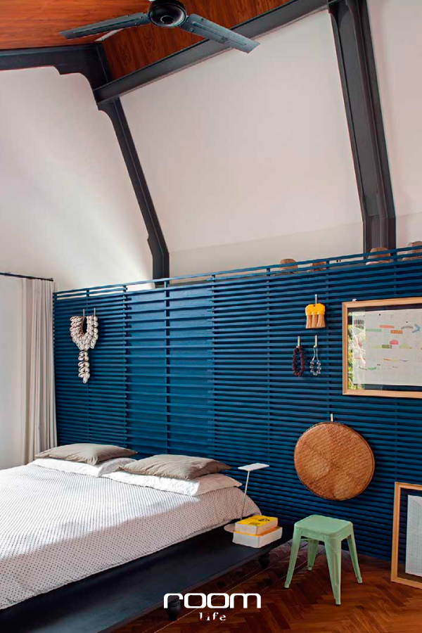 ไอเดียทำผนังหัวเตียงให้กลายเป็นฉากหรือพาร์ทิชันกั้นพื้นที่ในส่วนของห้องนอนและมุมแต่งตัว กลายเป็นผนังหัวเตียงที่มีฟังก์ชันการใช้งานครบครัน โครงสร้างฉากสามารถเลือกใช้ได้ทั้งไม้และเหล็กกล่อง กรุไม้อัดทำสีพ่นและปิดทับอีกชั้นด้วยระแนงไม้ขนาด 1 x 1 นิ้ว หรือ 1 x 2 นิ้ว ให้ดูมีมิติ นอกจากผนังหัวเตียงสีน้ําเงินจะสร้างจุดเด่นให้กับห้องแล้ว ยังทําหน้าที่ใช้แขวนของต่าง ๆ ได้ด้วย