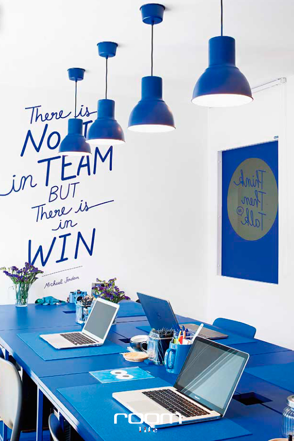 ไอเดียจากออฟฟิศ Apostrophys the Synthesis Server Co., Ltd. (เดิม) ที่เปลี่ยนบรรยากาศให้กับห้องสีขาวด้วยเฟอร์นิเจอร์สีน้ำเงินคุมโทนเหมือนกันทั้งห้อง ด้วยโต๊ะทำงานกลุ่มแบบ Long Table โคมไฟ พร็อปส์ตกแต่ง และเพ้นต์ผนังด้วยวลีเตือนใจในทุกวันด้วยสีน้ำเงินโทนเดียวกับโต๊ะ