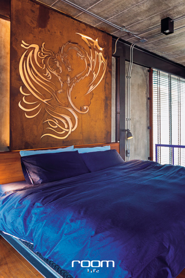 ไอเดียจากบ้านของคุณหวัน – วสันต์ ติรางกูร เลือกชุดเครื่องนอนโทนสีน้ำเงินเข้ม เพื่อตัดกับโทนสีของเหล็กจากวัสดุตกแต่งผนังหัวเตียง ซึ่งเป็นแผ่นเหล็กทำเลเซอร์ไดคัตรูปมังกรและหงส์ นอกจากนี้คุณหวันยังโชว์ฝีมือออกแบบเตียงเหล็กยื่นจากผนัง 2 เมตรด้วย นอกจากนี้เขายังตกแต่งอย่างเรียบง่าย ปูพื้นไม้เพื่อสร้างบรรยากาศอบอุ่นชวนพักผ่อน