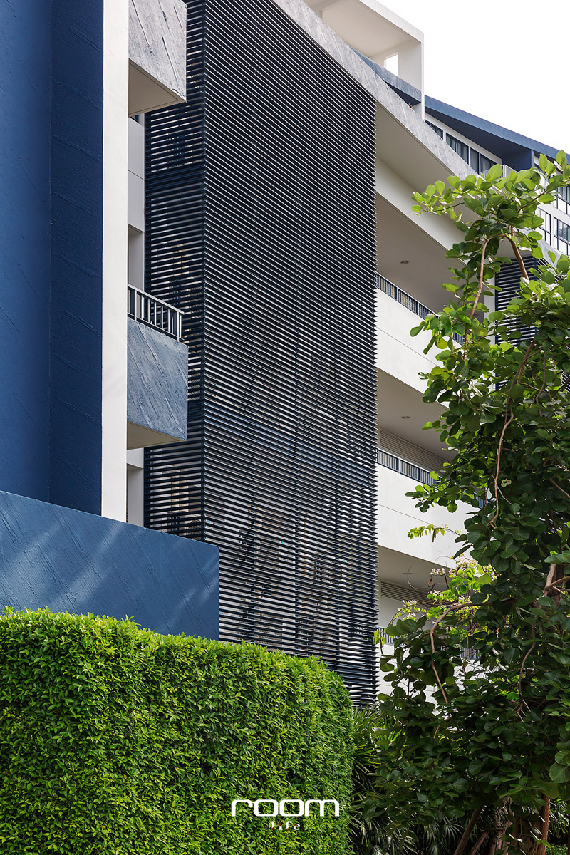 ไอเดียจากโครงการบ้านทิวทะเล บลูแซฟไฟร์ ตัวอาคารสีดำเงินโดดเด่นตั้งอยู่ท่ามกลางบรรยากาศร่มรื่นด้วยพรรณไม้ทรอปิคัลสีเขียวครึ้ม มีความเงียบสงบและเป็นส่วนตัวสูงมากๆ จุดเด่นของที่นี่คือการอำพรางความไม่น่าดูของงานระบบแอร์คอมเพรสเซอร์ ด้วยการออกแบบฟาซาดแผงไม้ระแนงทาสีน้ำเงินโทนเดียวกับสีทาอาคาร เพื่อไม่ให้อาคารดูทึบจนเกินไปและดูกลมกลืนเป็นหนึ่งเดียวกัน