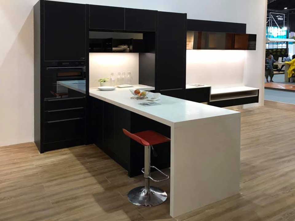 หน้าบานตู้หรือเคาน์เตอร์ที่เลือกวัสดุปิดผิวเป็นกระจกพ่นสี ก็เป็นอีกหนึ่งวัสดุที่ป้องกันความชื้นได้ดี งานออกมาดูเรียบหรู โดดเด่น ซึ่งกระจกที่ GIO เลือกใช้ผลิตด้วยเทคโนโลยีขั้นสูง มีทั้งแบบเงา กึ่งเงา และแบบด้านให้เลือก จุดเด่นของหน้าบานกระจกพ่นสีคือประกอบเข้ากับตัวเฟรมอะลูมิเนียมด้วยขั้นตอนที่พิถีพิถัน เรียบเนียน ไม่มีน็อตเกะกะสายตา จึงได้ชุดครัวที่สวยสมราคาอย่างแน่นอน
