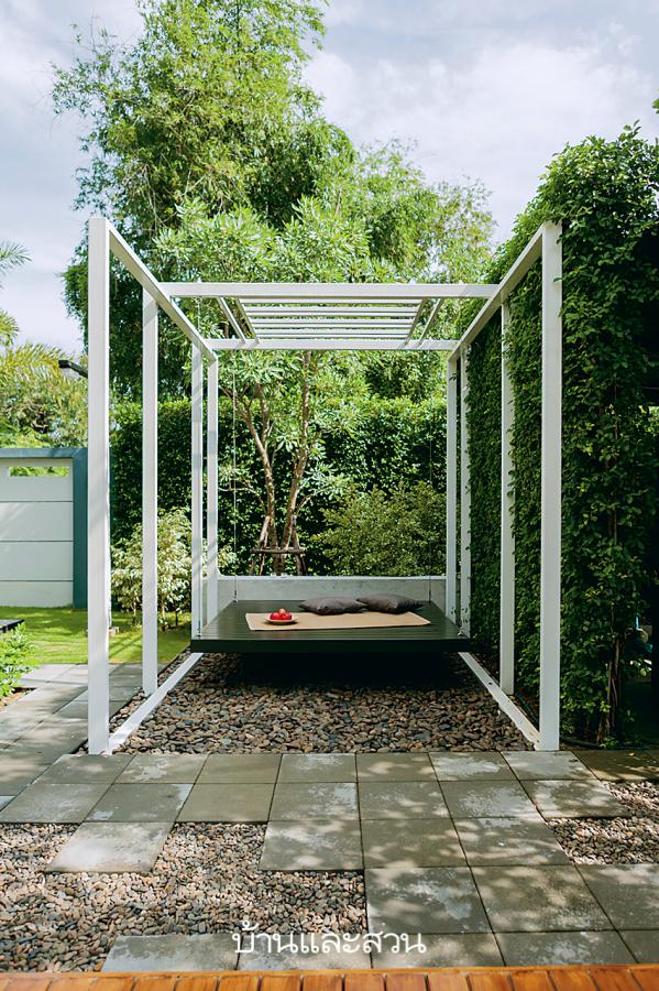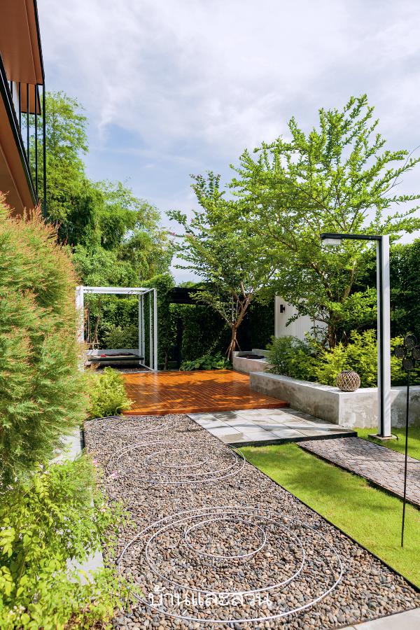 บ้านโมเดิร์นที่นำกลิ่นอาย สวนญี่ปุ่น มาใช้สร้างบรรยากาศร่มรื่น เด่นด้วยไม้ลำต้นฟอร์มสวย พื้นโรยก้อนหินเเละกรวดเเม่น้ำตามแบบอย่างของสวนหินญี่ปุ่น ก่อนจะแซมด้วยไม้ดอกโทนสีขาว-ชมพู พร้อมมุมนั่งเล่นพักผ่อนหลากหลายมุม นเเญี่