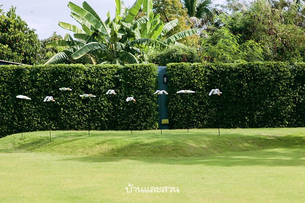 ท่ามกลางบรรยากาศธรรมชาติที่เงียบสงบของอำเภอกระทุ่มแบน จังหวัดสมุทรสาคร บ้านสไตล์โมเดิร์นหลังใหญ่ที่เรามาเยือนนี้มีพื้นที่กว้างขวางต่างไปจากบ้านในละแวกเดียวกัน เมื่อผ่านประตูรั้วเข้ามาในบริเวณบ้าน ฝั่งซ้ายเป็นสนามหญ้ากว้างสบายตา ฝั่งขวาเป็นสวนหย่อมที่ดูร่มรื่น เเต่ก็อดแปลกใจไม่ได้ว่าทำไมพื้นที่จัดสวนถึงมีไม่มากนัก กระทั่งเราเดินเข้าไปทักทายเจ้าของบ้าน คุณนุช – ชยพล ธรรมสังวาล ซึ่งนั่งอยู่ริมสระว่ายน้ำ จึงได้เห็นสวนขนาดใหญ่ที่ซ่อนอยู่ด้านหลังบ้านนี่เอง สว