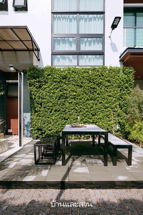 “วัสดุและสีที่ใช้ในสวนก็ดึงมาจากตัวบ้านเพื่อให้ดูสัมพันธ์กัน เป็นสีธรรมชาติแนวเอิร์ธโทน เพราะอยากให้ภาพรวมของสวนดูเรียบๆ เท่ๆ เช่น เหล็กสีดำ ค็อบเบิลสโตน ก้อนหินประดับสีเทา พื้นไม้เทียมสีน้ำตาล ต้นไม้เน้นสีเขียวเป็นหลัก อยากให้ดูสะอาดๆ ใช้ไม้ตัดแต่งให้ดูเท่ๆ แซมด้วยไม้ดอกโทนสีขาวชมพู ไม้ใหญ่ปลูกอยู่ด้านริมของพื้นที่เพื่อให้พื้นที่ตรงกลางเปิดโล่ง ทุกอย่างทำเป็นบล็อกให้ดูเป็นระเบียบ สวนออกแนวโมเดิร์นแต่ก็ให้อารมณ์สวนญี่ปุ่นนิดๆ เช่น พื้นโรยกรวด ตกแต่งด้วยก้อนหินประดับ ปลูกไม้พุ่มหรือไม้ที่มีฟอร์มนิ่งๆ เหมือนบอนไซ เพื่อตอบสนองความต้องการของเจ้าของบ้านที่อยากได้สวนหินสวนญี่ปุ่นครับ”