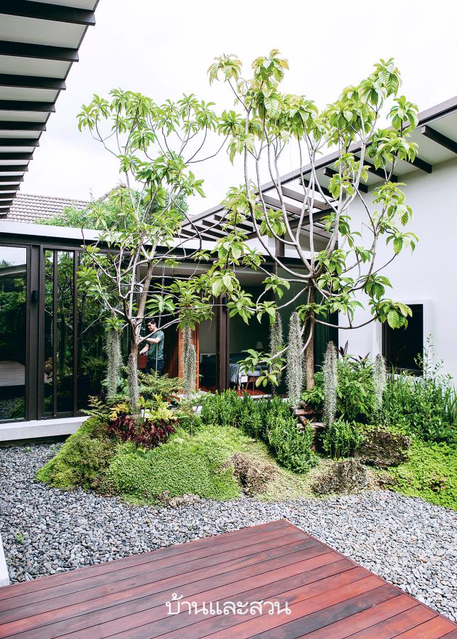 พื้นที่สวนบริเวณคอร์ตตรงกลางได้ทำหน้าที่ปอดธรรมชาติของบ้านไว้อย่างดี เพราะไม่ว่าจะอยู่มุมไหนของบ้านก็สามารถมองออกมาพินิจความหลากหลายของพรรณไม้ ที่ผสมกลมกลืนอยู่ร่วมกันทั้งไม้ยืนต้น ไม้พุ่ม และไม้คลุมดิน โดยเฉพาะยังได้นั่งลงที่ระเบียงกว้าง คอยดูรูปทรงและความเติบโตของเหล่าพรรณไม้นี้ได้อย่างสงบสุข เหมือนที่เคยเกิดขึ้นในวัดแห่งหนึ่งที่เกียวโต