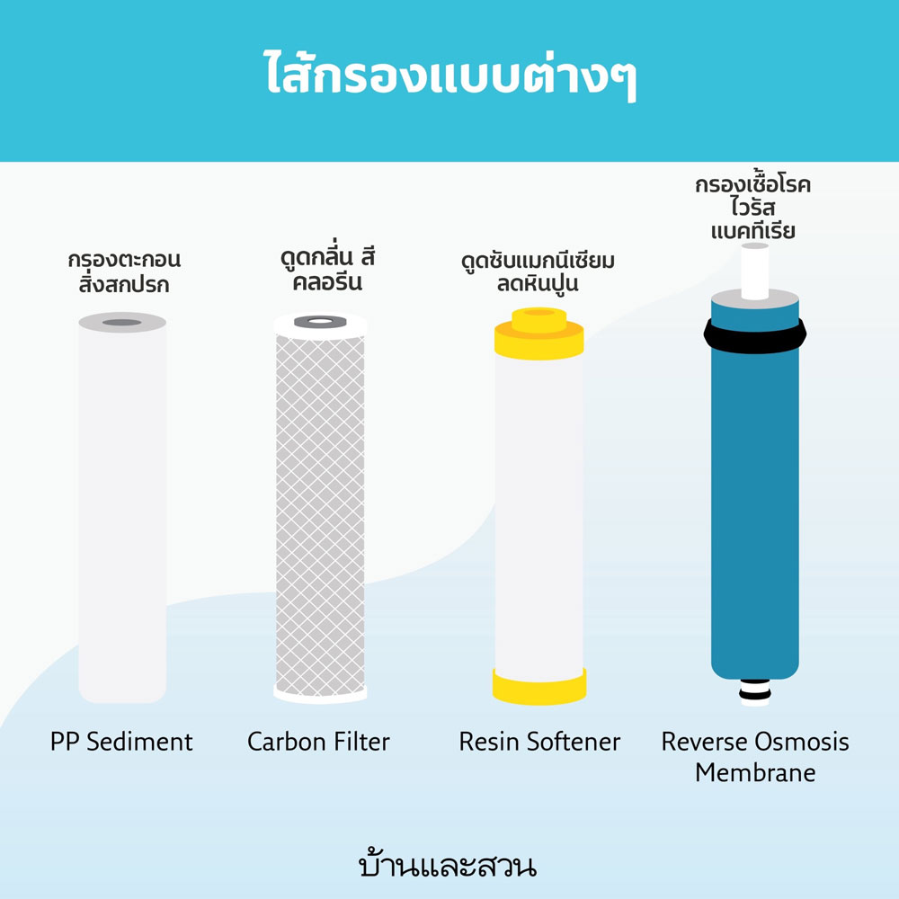 - ไส้กรอง Nano Filtration สามารถกรองได้ละเอียดถึง 001 ไมครอน แต่ไม่เป็นที่นิยม เพราะไม่มีระบบระบายน้ำทิ้งจึงเกิดการอุดตันได้ง่าย อายุการใช้งานโดยประมาณ 1 ปี