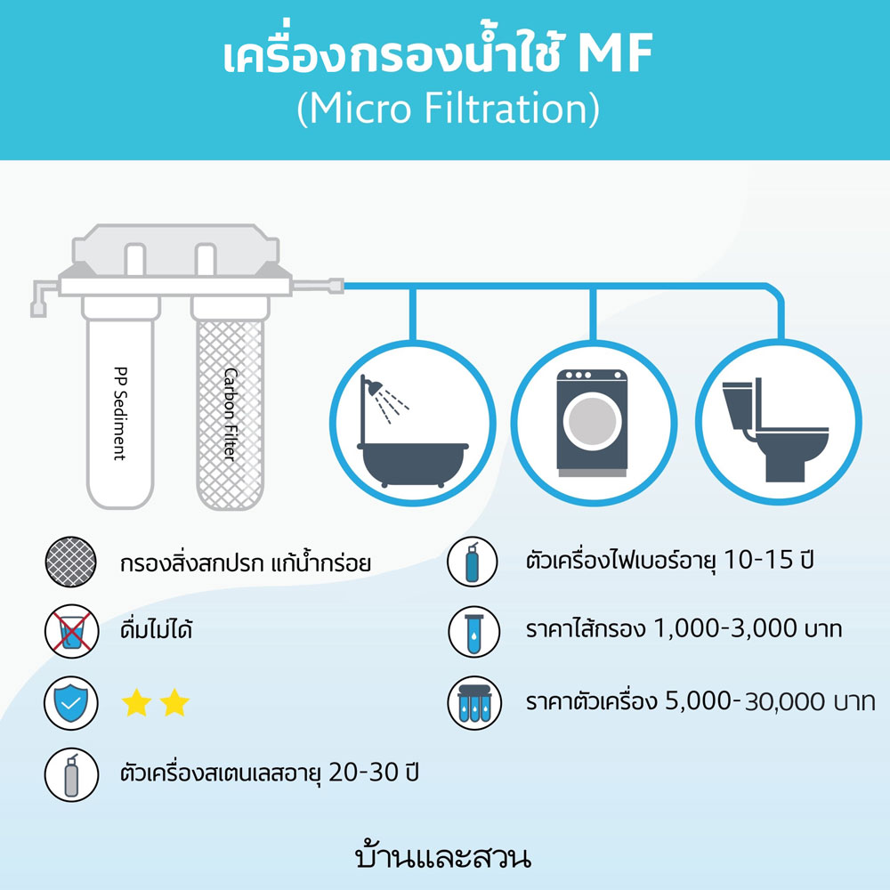 สามารถกรองน้ำและปรับคุณภาพน้ำให้เหมาะสมต่อการใช้งาน เพื่อนำเข้าสู่ระบบกรองน้ำดื่มต่อไป มีความละเอียด 0.3-0.01 ไมครอน แรงดันประปามาตรฐาน ไม่ต้องใช้ไฟฟ้า ช่วยแก้ปัญหาน้ำกร่อย น้ำเค็ม และน้ำกระด้าง ก่อนเข้าสู่ระบบประปาภายในบ้าน นอกจากนี้ยังสามารถกรองสี กลิ่น และเชื้อโรคได้ แต่ยังไม่ใช่น้ำคุณภาพดีที่จะใช้ดื่มได้ อาจต้องกรองเพิ่ม หรือต้มอีกครั้ง ตัวเครื่องที่ทำจากไฟเบอร์ มีอายุการใช้งาน 10-15 ปี แต่ต้องอยู่ในร่ม หากติดตั้งนอกบ้านให้เลือกตัวเครื่องสแตนเลส มีอายุการใช้งาน 20-30 ปี ราคาเริ่มต้นที่ 5,000-30,000 บาท ขึ้นอยู่กับขนาด ส่วนไส้กรองราคาเริ่มที่ 1,000-3,000 บาท มีอายุ 1-3 ปี