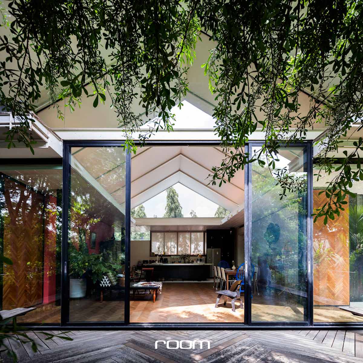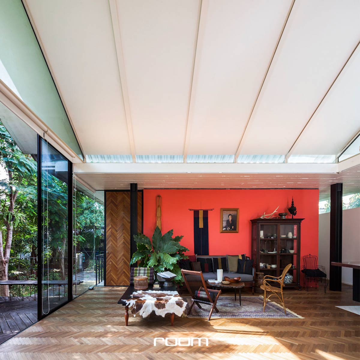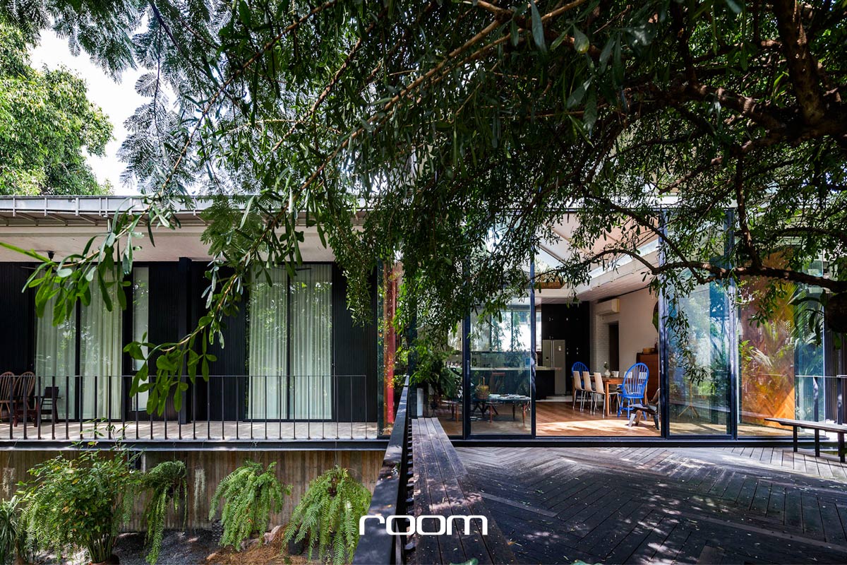 อีกส่วนที่บ้านหลังนี้ให้ความสำคัญคือการเชื่อมต่อกับพื้นที่สวนธรรมชาติด้านนอก ด้วยการเปิดด้านยาวของอาคารทั้งหมดออกสู่วิวสวน ผ่านผนังกระจกบานใหญ่ยาวตลอดแนวระเบียง นอกจากนี้ยังมีอีกหนึ่งจุดสำคัญของบ้านนั่นคือ คอร์ตกลาง ซึ่งเป็นส่วนของห้องนั่งเล่น ห้องรับประทานอาหาร และครัวแบบโอเพ่นแปลน ที่เชื่อมต่อการใช้งานออกไปถึงคอร์ตหน้าบ้านซึ่งเป็นพื้นที่ใต้ร่มเงาไม้ใหญ่