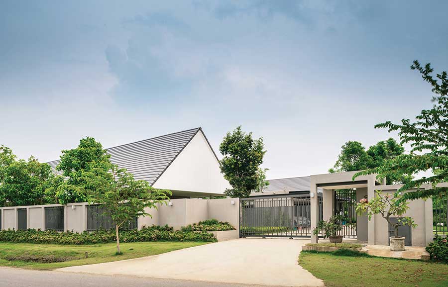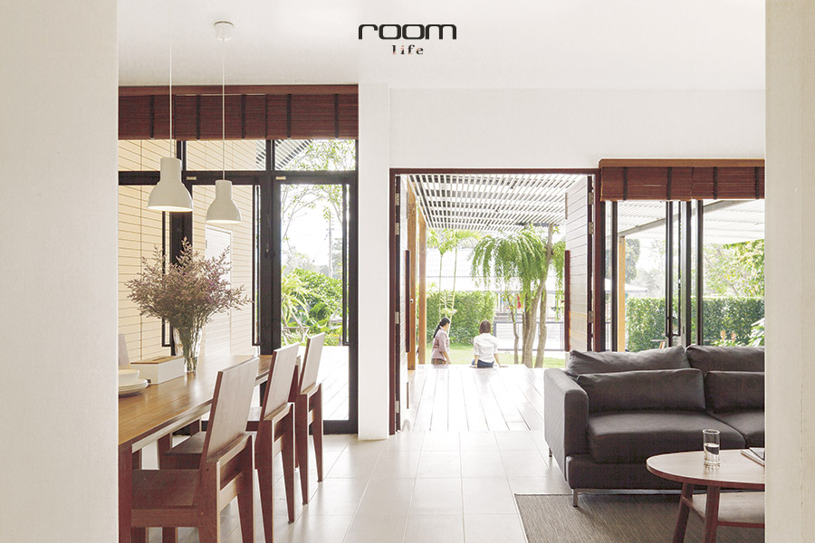 ส่วนรูปแบบของหลังคา สถาปนิกอยากเพิ่มความพิเศษให้อาคารจึงเลือกใช้หลังคาทรงจั่ว ในขณะเดียวกันก็ช่วยเพิ่มพื้นที่และเอื้อประโยชน์ต่อการระบายความร้อนภายในอาคาร เพราะความร้อนจะลอยตัวขึ้นที่สูง แล้วระบายออกผ่านช่องเปิดด้านบนที่ทำไว้ทั้งด้านหน้าและด้านหลัง แถมลมยังพัดเข้ามาได้อย่างทั่วถึง อากาศภายในอาคารจึงเย็นสบายตลอดวัน
