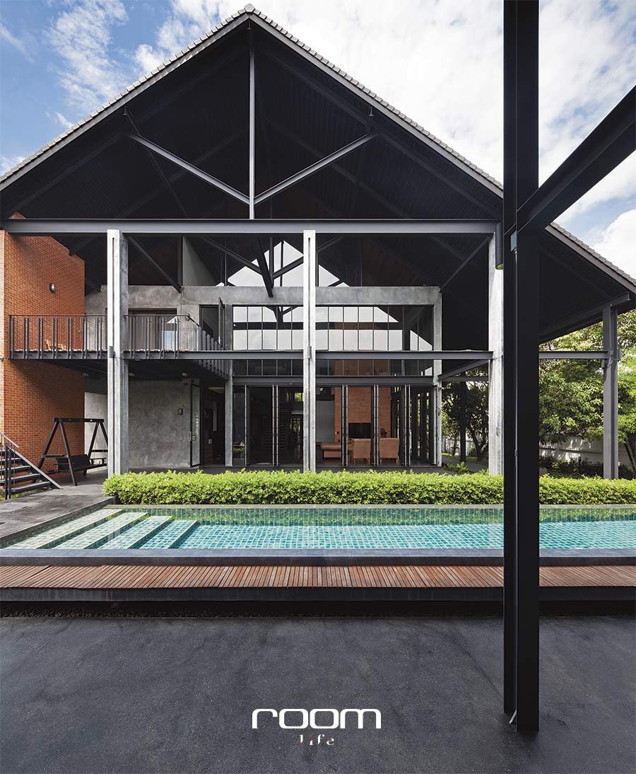 พื้นที่ภายในเน้นออกแบบฟังก์ชันการใช้งานให้เหมาะกับพฤติกรรมของคนในบ้าน ประกอบกับพื้นที่โล่งแบบดับเบิ้ลสเปซ มีมุมนั่งเล่นมองเห็นบรรยากาศได้โดยรอบไม่ว่าจะเป็นสวนหย่อม สระว่ายน้ำ ผ่านหน้าต่างกระจกสูงจรดหลังคาจั่วด้านบน พร้อมเปิดรับลมให้พัดผ่านเข้ามาได้สบายตลอดทั้งวัน มีโทนสีน้ำตาลของไม้ดูอบอุ่นสบายตา แต่ก็ยังคงความเท่ด้วยโครงสร้างเหล็กสีดำดูสอดคล้องกันทั่วทั้งบ้าน
