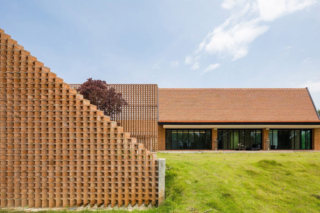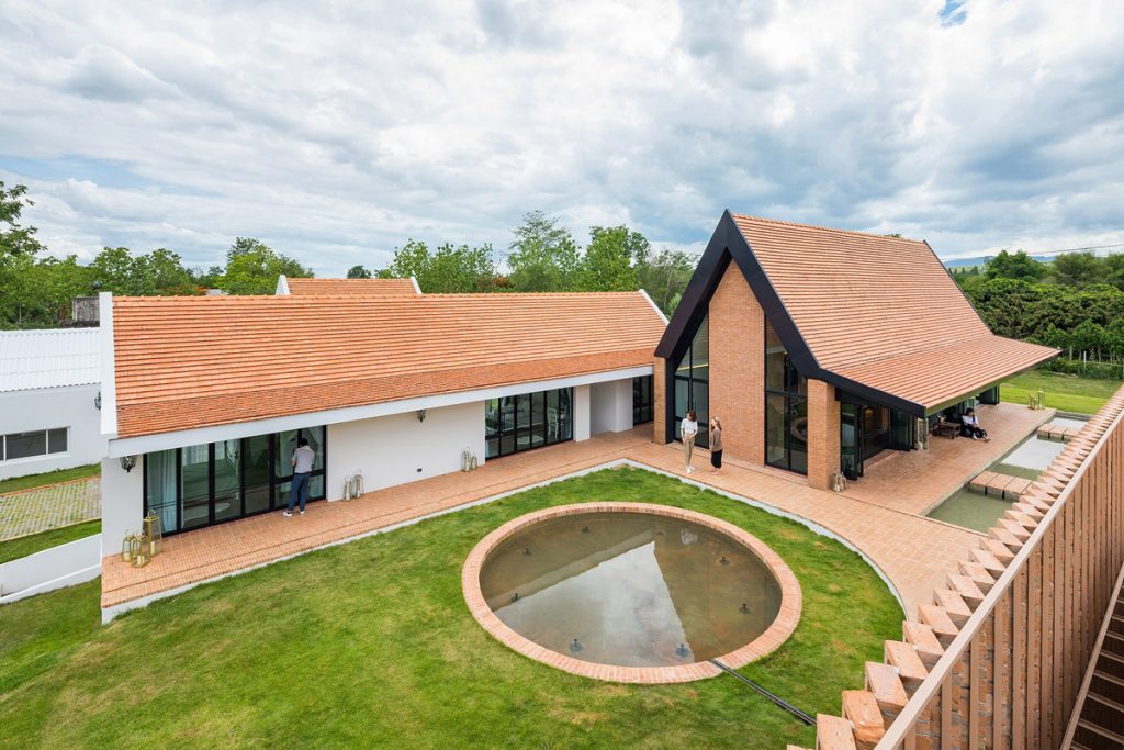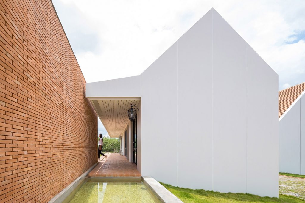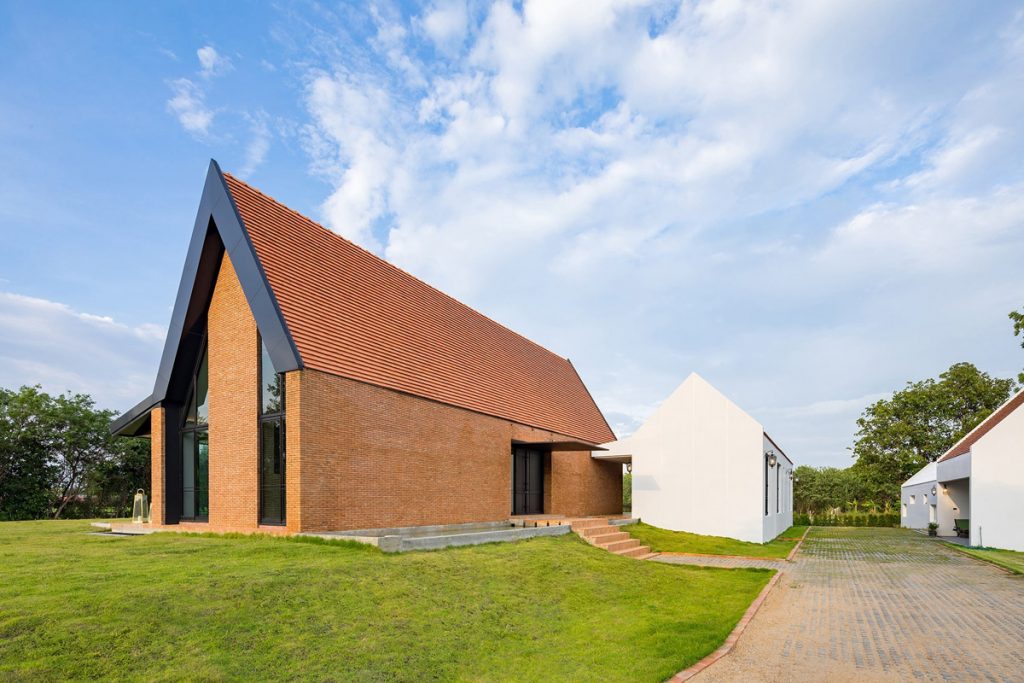 เมื่อเจ้าของบ้านอยากได้บ้านพักตากอากาศสไตล์อังกฤษ ที่มีเอกลักษณ์คือหลังคาหน้าจั่วทรงสูง แต่เพื่อปรับให้เข้ากับบริบทของเมืองไทยที่มีอากาศแบบร้อนชื้นจึงเลือกออกแบบให้เหมาะกับเขตทรอปิคัลมากกว่า ผลลัพธ์จึงออกมาเป็นอาคารอิฐหลังคาหน้าจั่วทรงสูง ผสมผสานกับวัสดุสมัยใหม่ อย่าง กระจก เด่นด้วยเส้นสาย และระนาบสีดำสร้างกลิ่นอายของ Half-Timbering ตั้งตระหง่านท่ามกลางกลุ่มอาคารหลังเล็กสีขาวเรียบง่าย